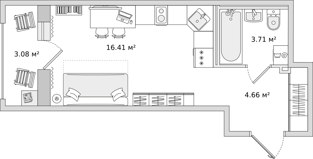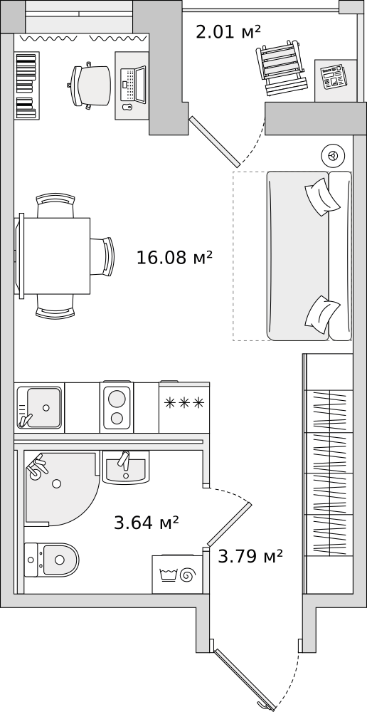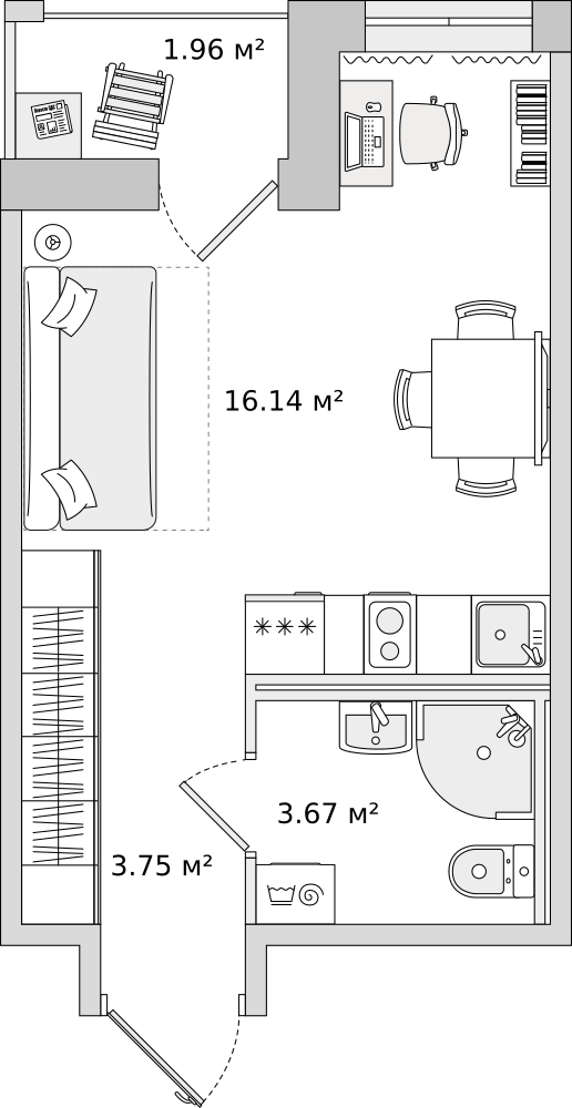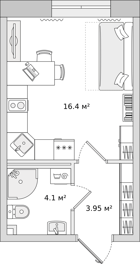Цветовая гамма построена на сочетании светлых и темных оттенков благородного серого, строгого черного и контрастных ярких цветов. Стильная акцентная геометрия на стенах добавляет свежесть и оригинальность пространству.