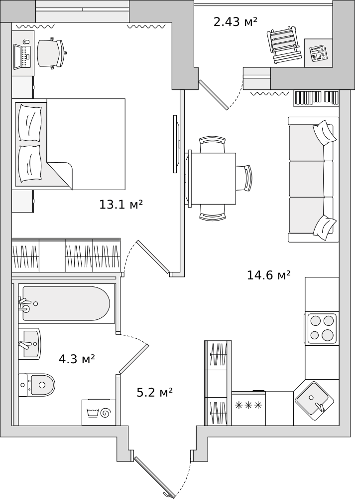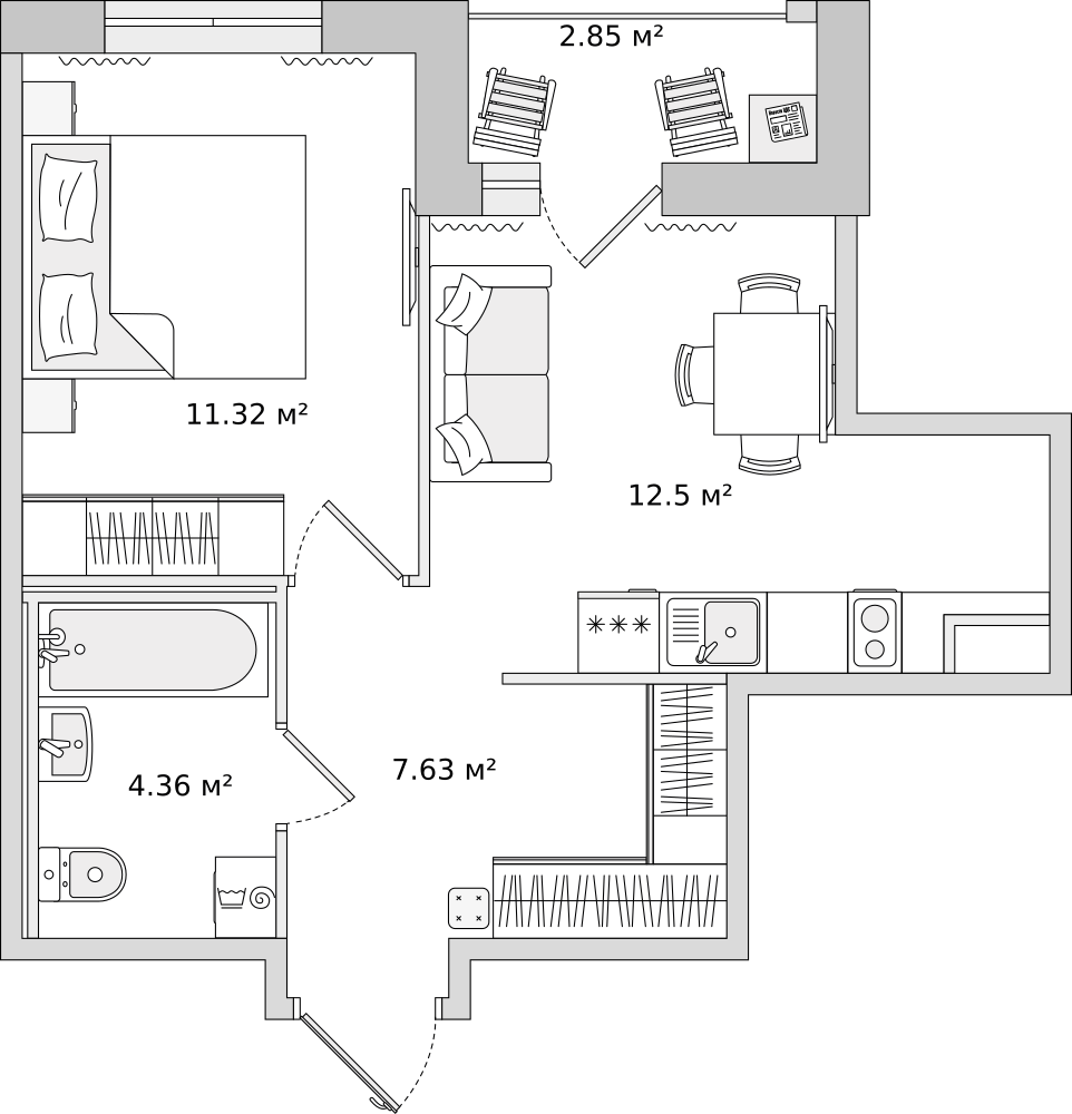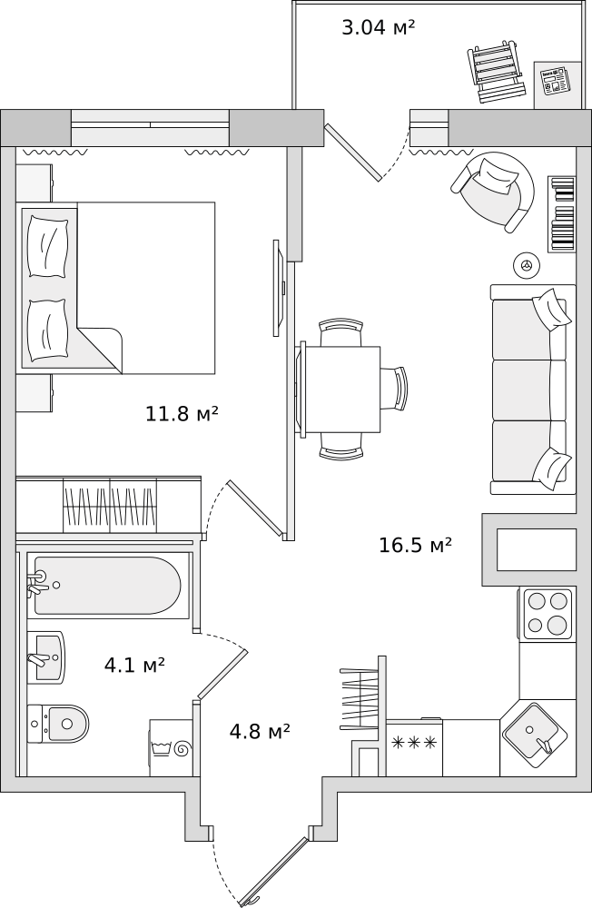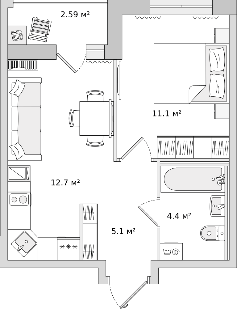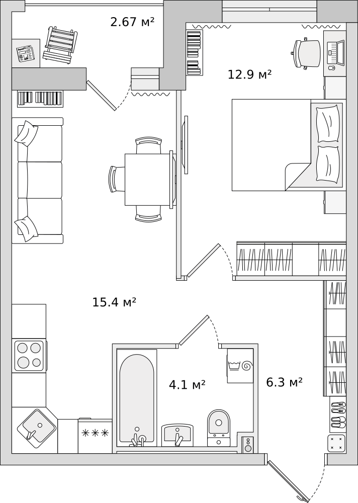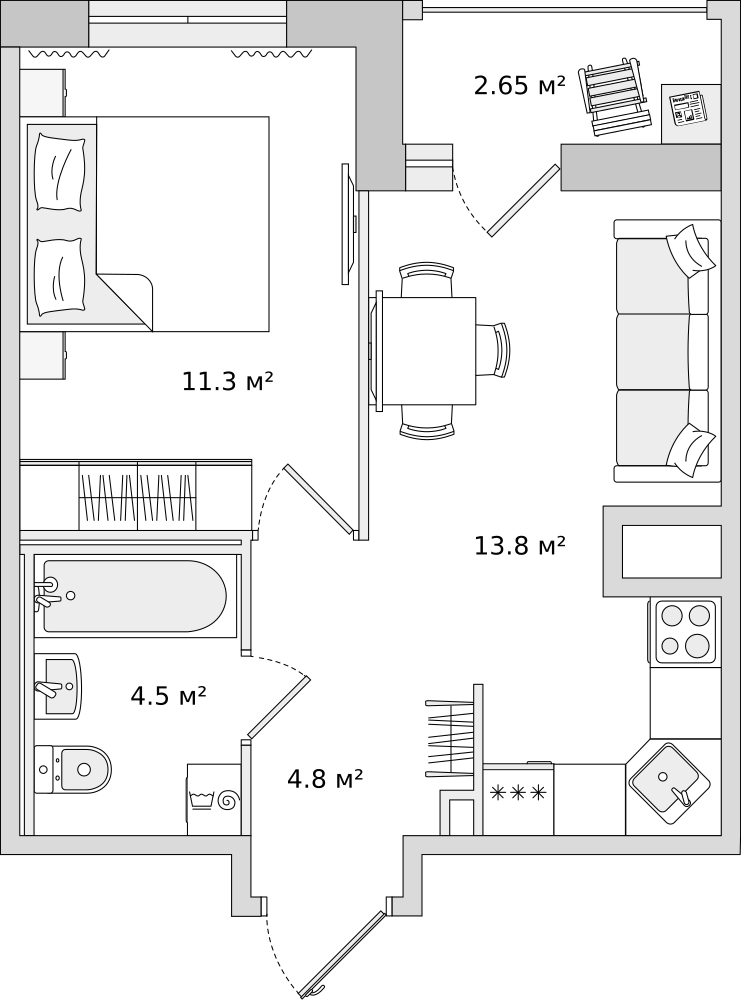 Цветовая гамма построена на сочетании светлых и темных оттенков благородного серого, строгого черного и контрастных ярких цветов. Стильная акцентная геометрия на стенах добавляет свежесть и оригинальность пространству.