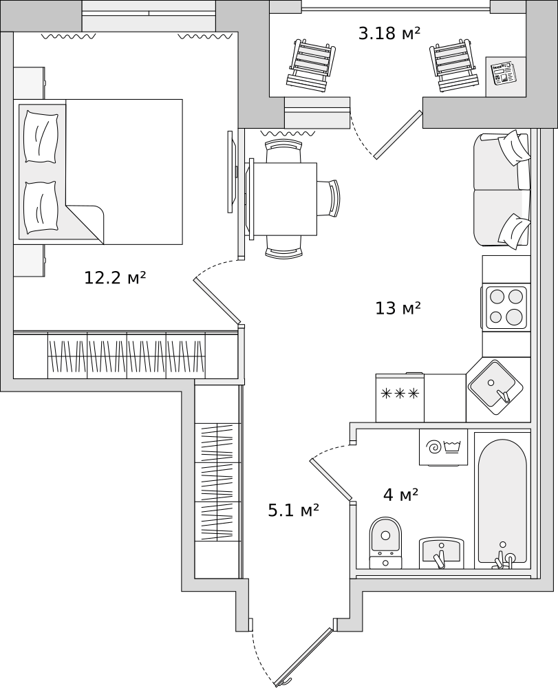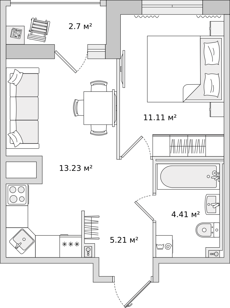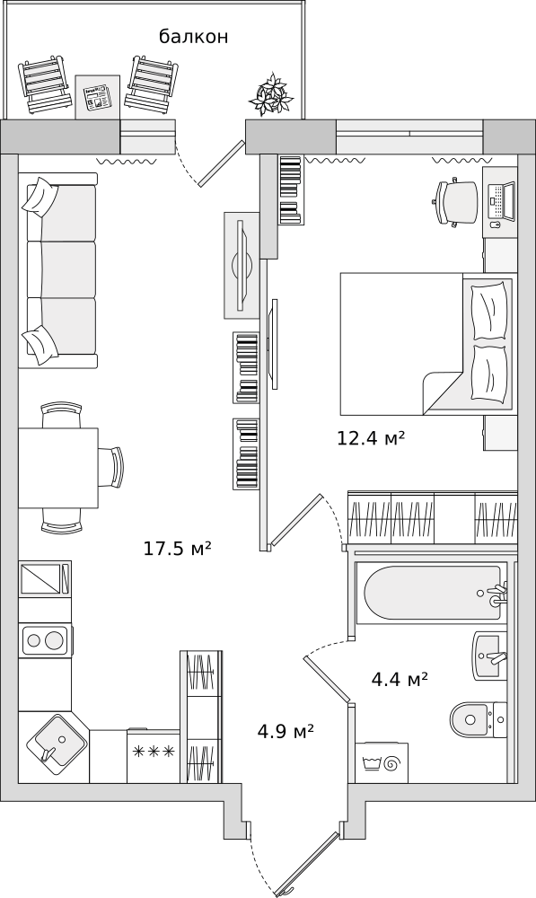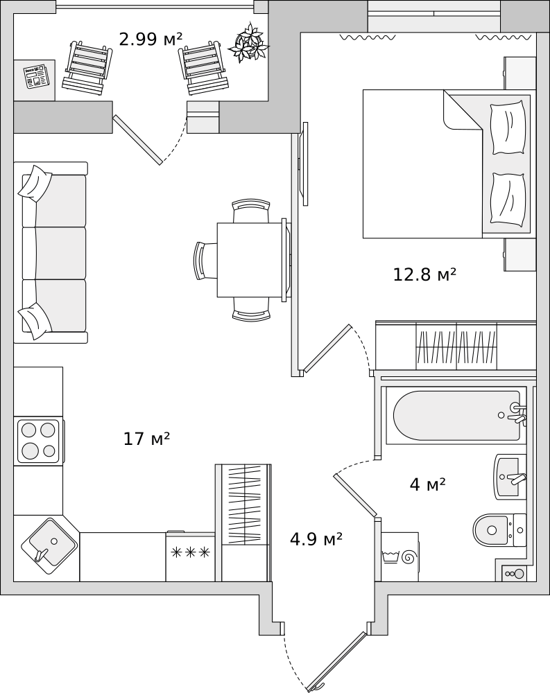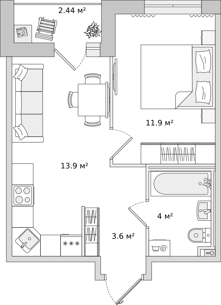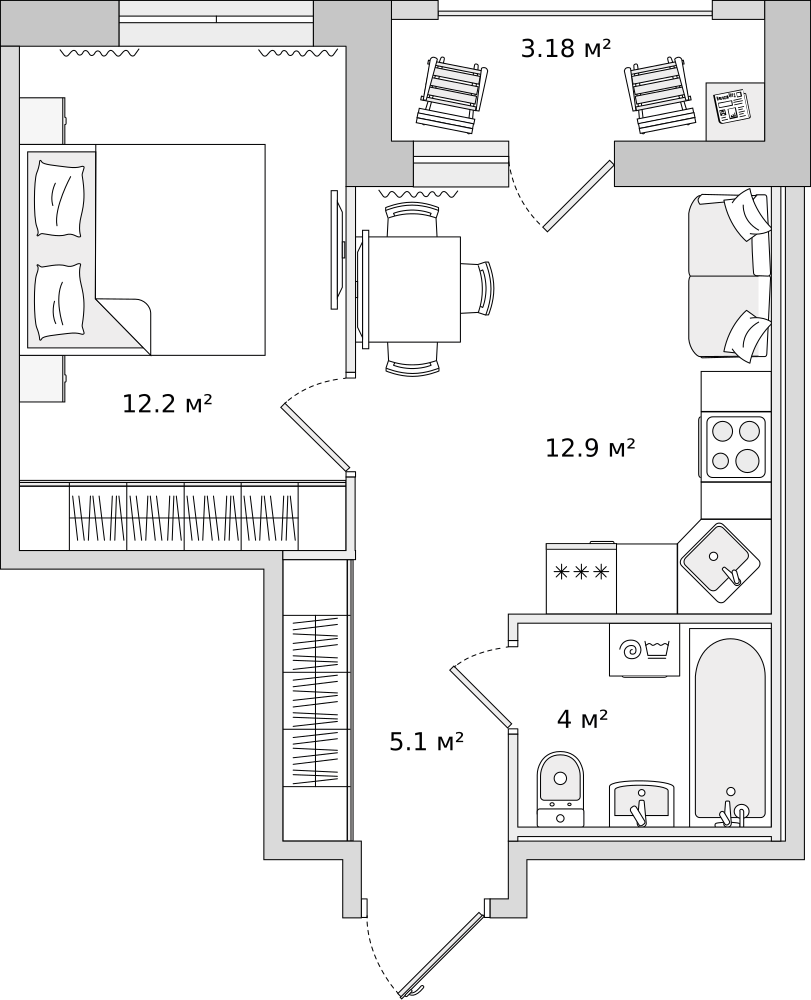 Цветовая гамма построена на сочетании светлых и темных оттенков благородного серого, строгого черного и контрастных ярких цветов. Стильная акцентная геометрия на стенах добавляет свежесть и оригинальность пространству.