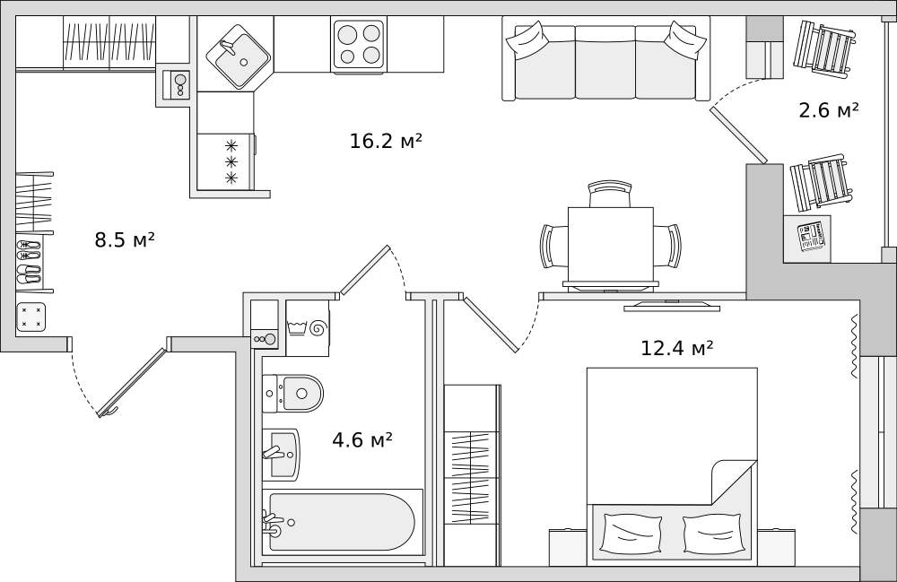 Цветовая гамма построена на сочетании светлых и темных оттенков благородного серого, строгого черного и контрастных ярких цветов. Стильная акцентная геометрия на стенах добавляет свежесть и оригинальность пространству.