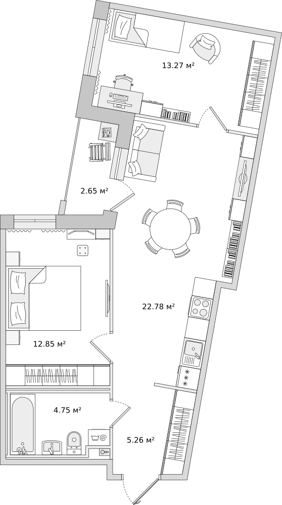 Цветовая гамма построена на сочетании светлых и темных оттенков благородного серого, строгого черного и контрастных ярких цветов. Стильная акцентная геометрия на стенах добавляет свежесть и оригинальность пространству.