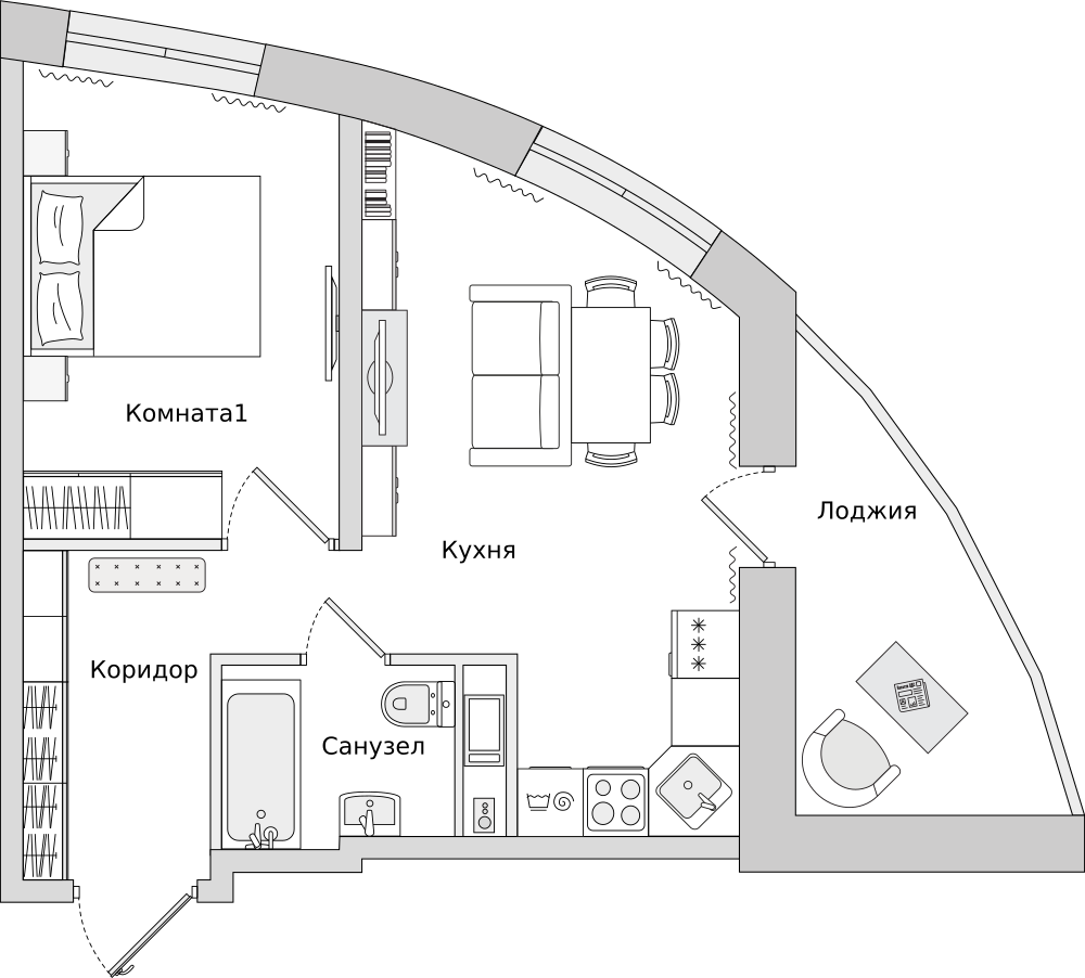 Цветовая гамма построена на сочетании светлых и темных оттенков благородного серого, строгого черного и контрастных ярких цветов. Стильная акцентная геометрия на стенах добавляет свежесть и оригинальность пространству.