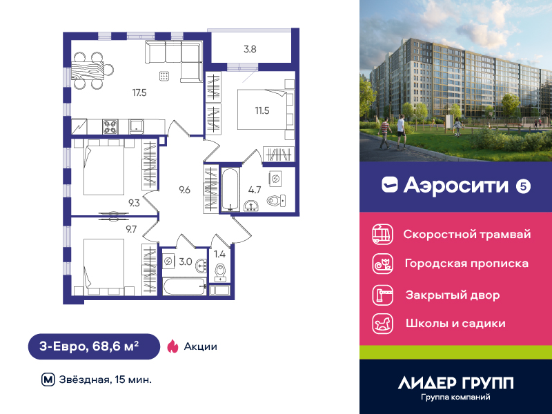 Евро трехкомнатные квартиры в ЖК «AEROCITY 5 (Аэросити 5)»