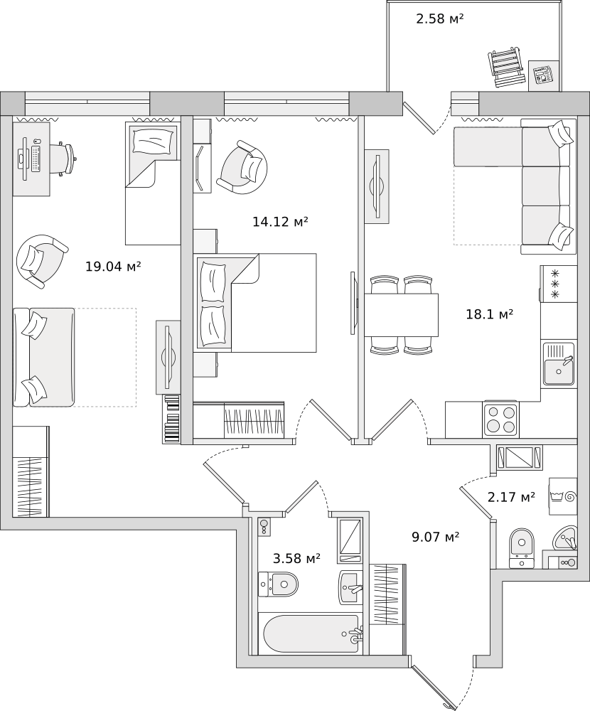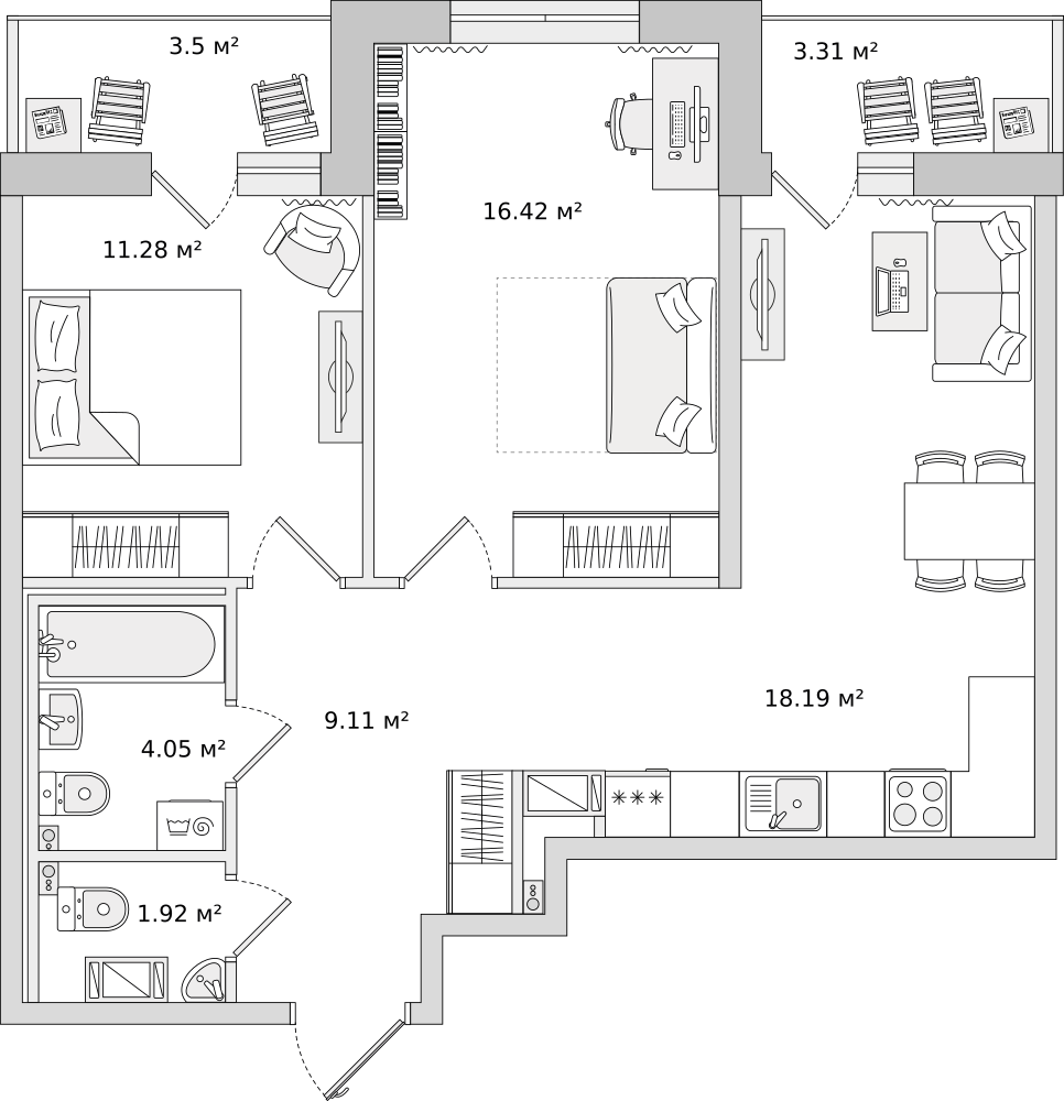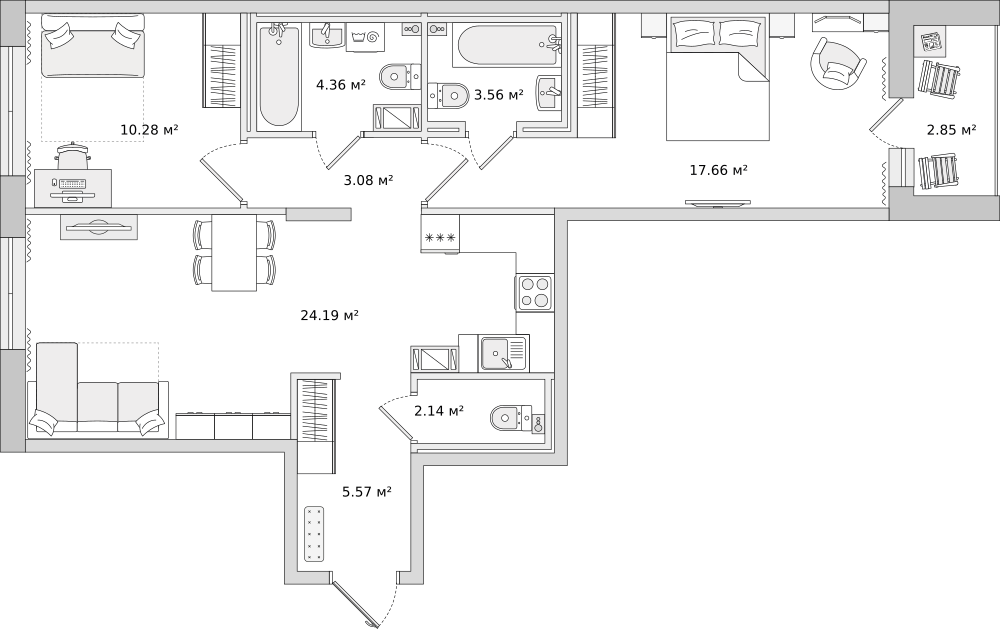 Мы продумали все детали и нашли решения для самых взыскательных покупателей: большие кухни‐гостиные для вечерних семейных посиделок и шумных вечеринок с друзьями или просторные террасы для отдыха и релаксации, постирочные зоны вдали от спальных комнат или ванные комнаты с окном для роскошной жизни.