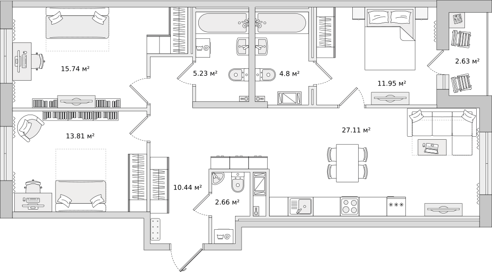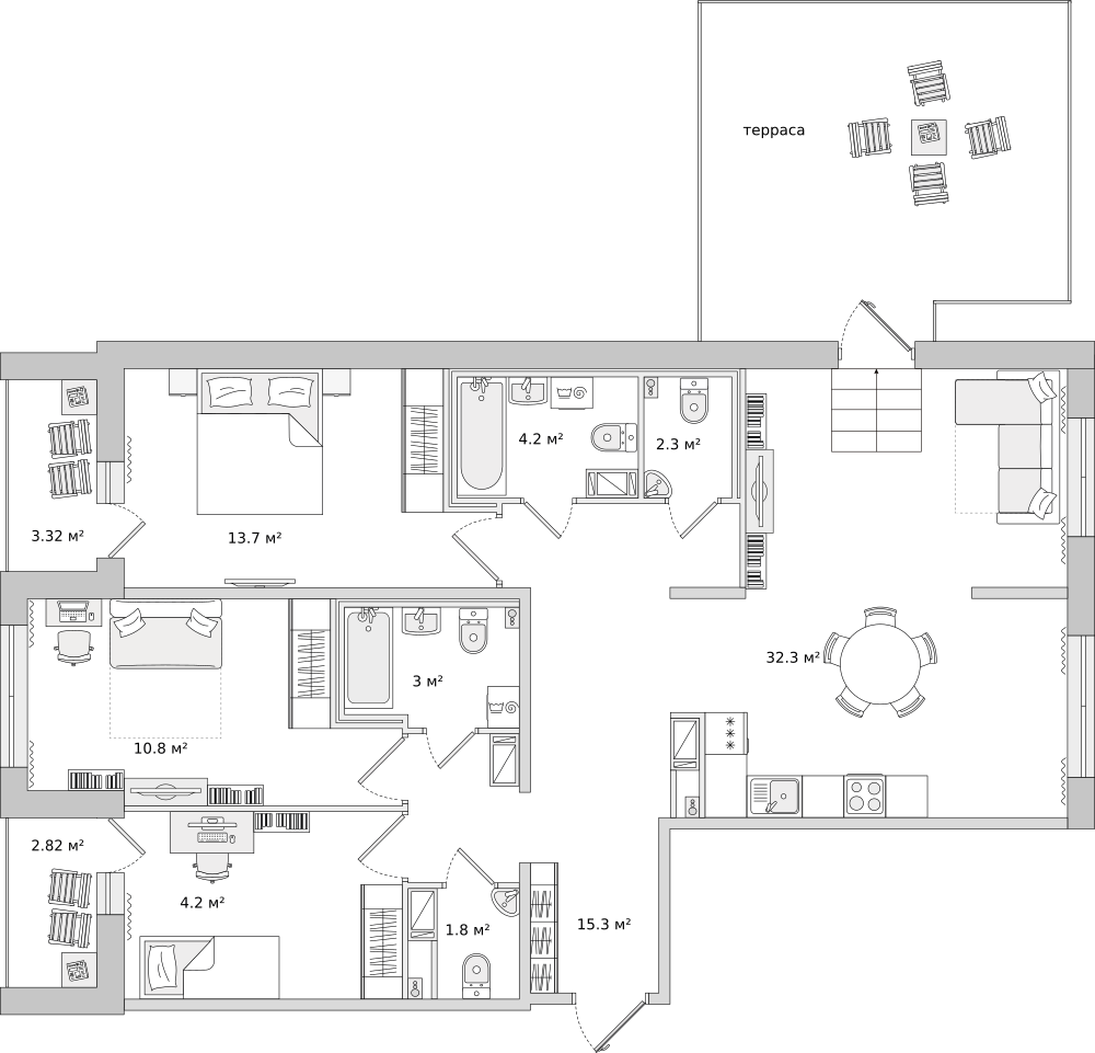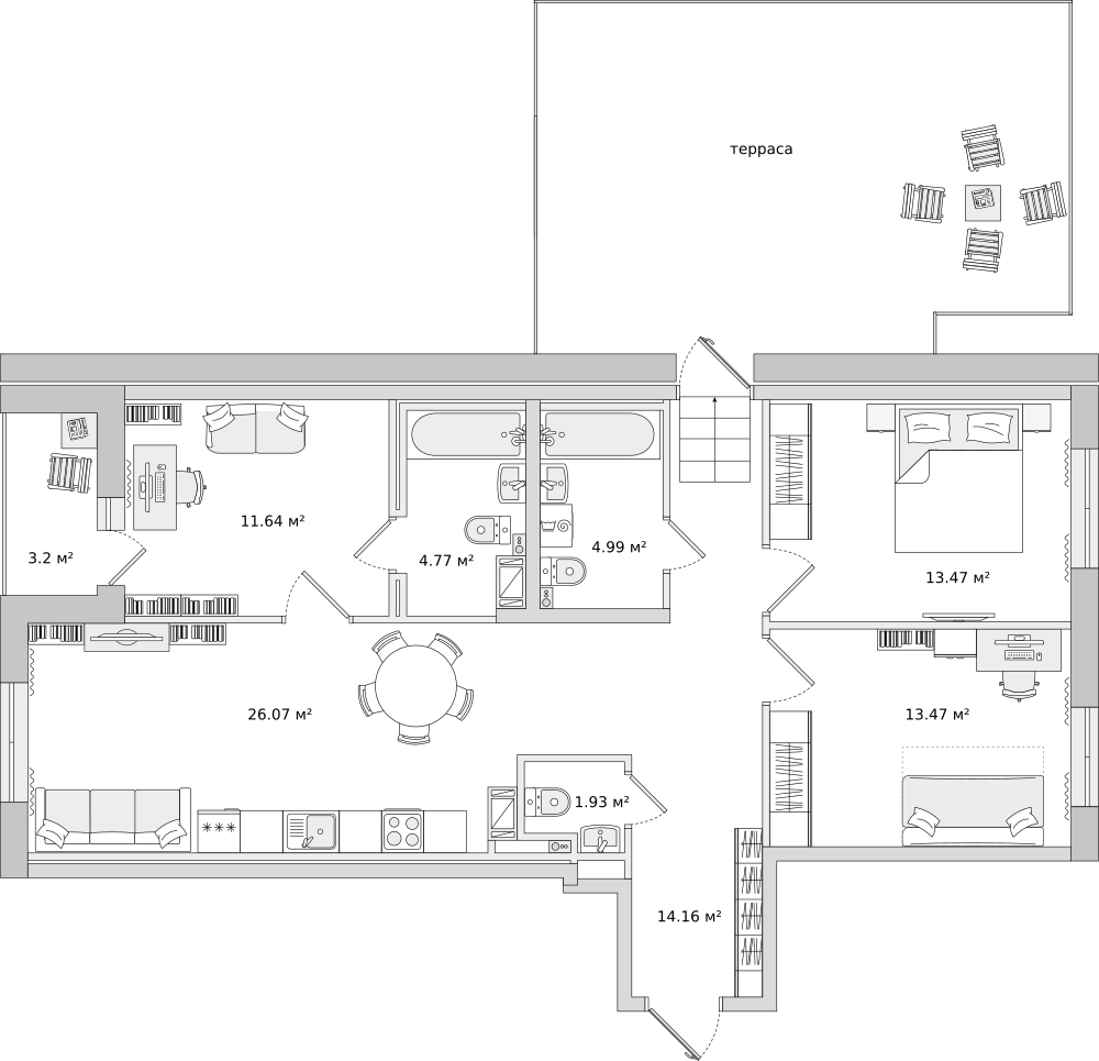 Мы продумали все детали и нашли решения для самых взыскательных покупателей: большие кухни‐гостиные для вечерних семейных посиделок и шумных вечеринок с друзьями или просторные террасы для отдыха и релаксации, постирочные зоны вдали от спальных комнат или ванные комнаты с окном для роскошной жизни.