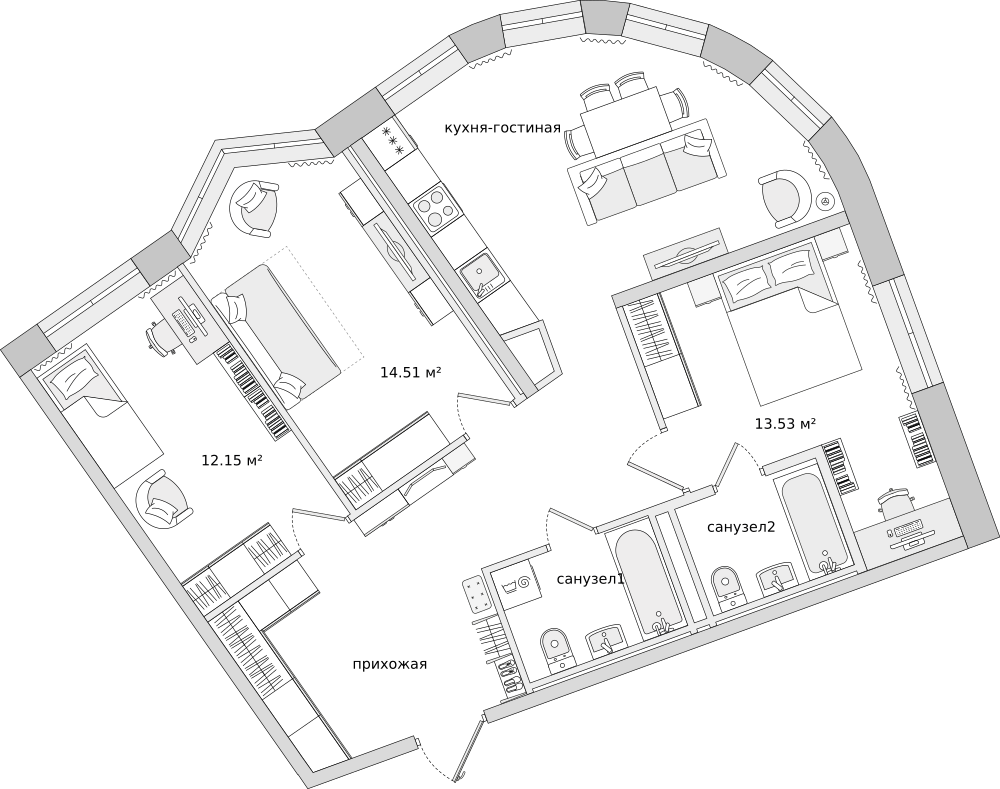 Евро 3-комнатная (88.8м2)