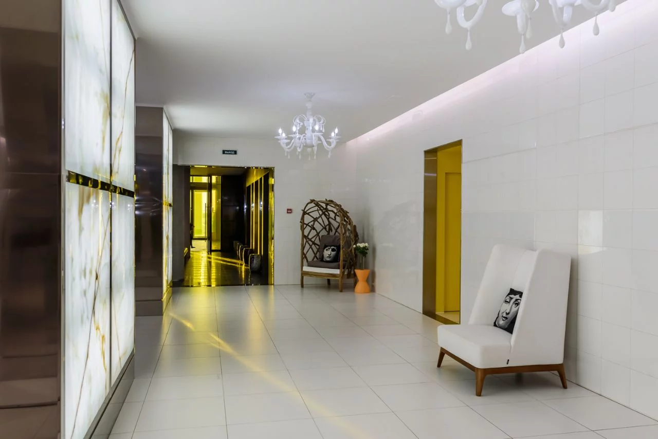 Просторные холлы имеют эксклюзивный дизайн интерьера: потолки 12 м, колоны, авторская мебель и зеркала создают незабываемую камерную атмосферу. Дом находится под круглосуточным видеонаблюдением, имеется консьерж и круглосуточная охрана. В общей зоне имеется комната для переговоров, собственная бильярдная, помещение для отдыха обслуживающего персонала. А на причале есть места для стоянки яхт и своя собственная набережная длиной 600 м. Рядом с домом имеется частная школа.