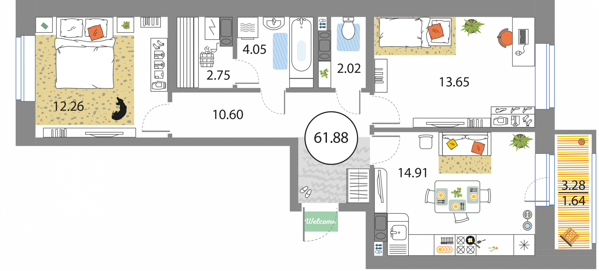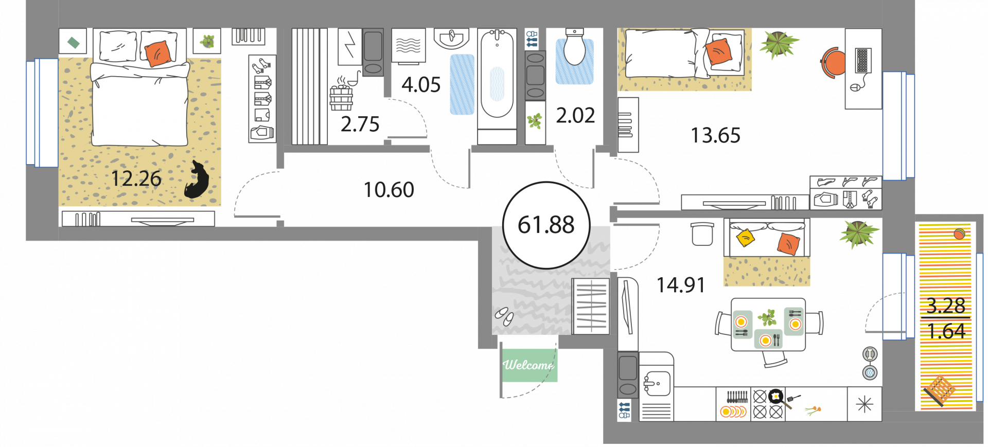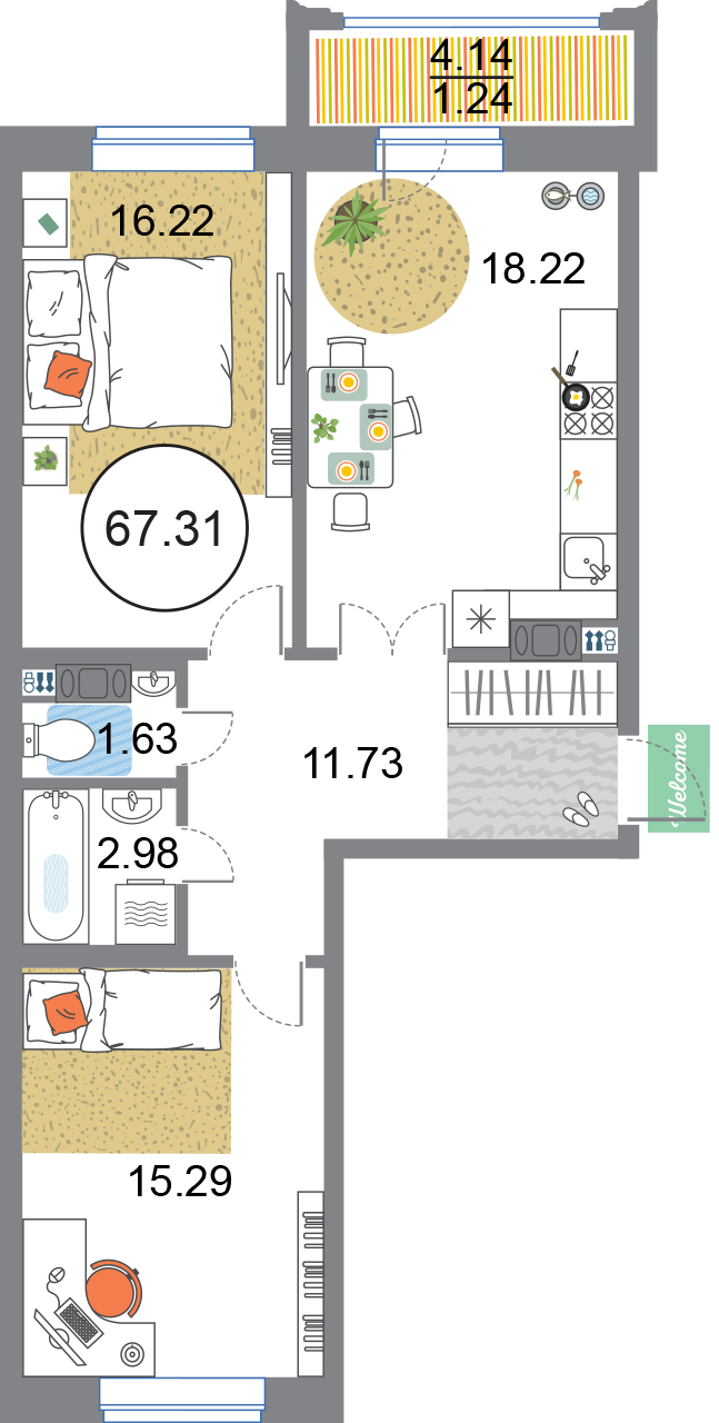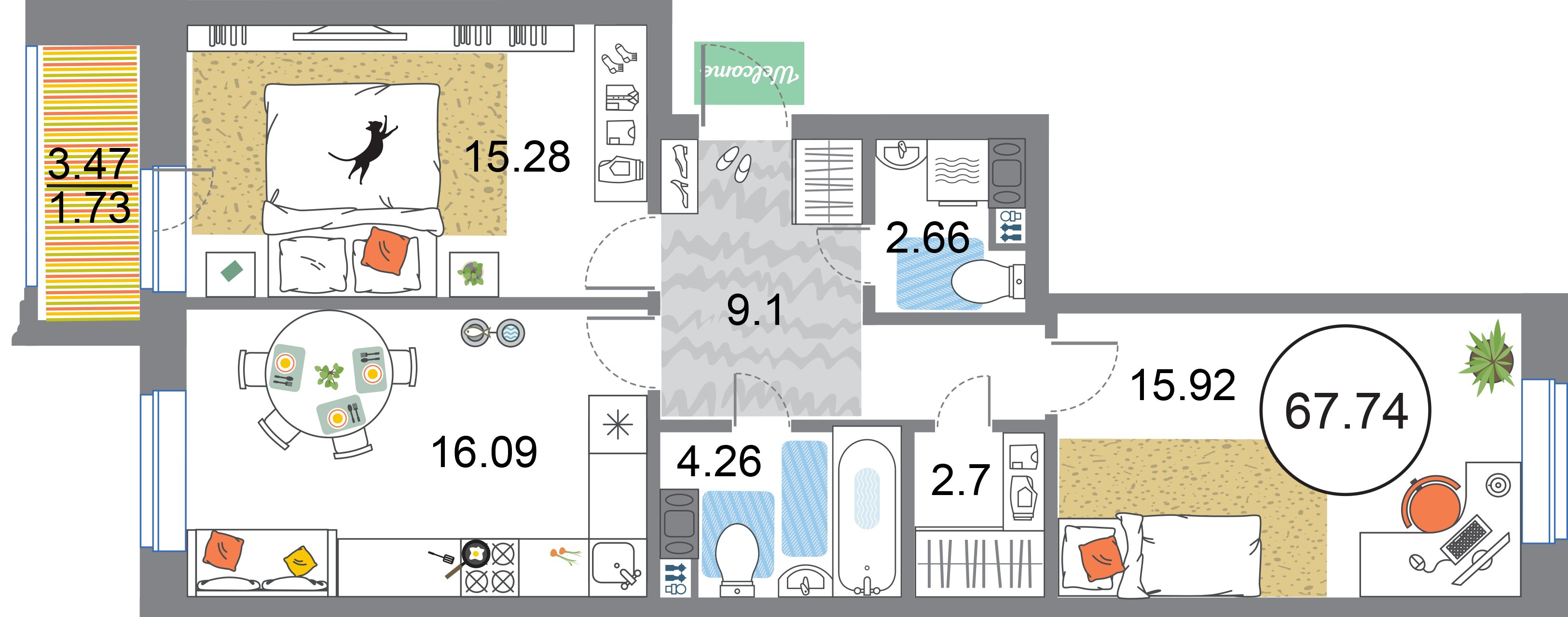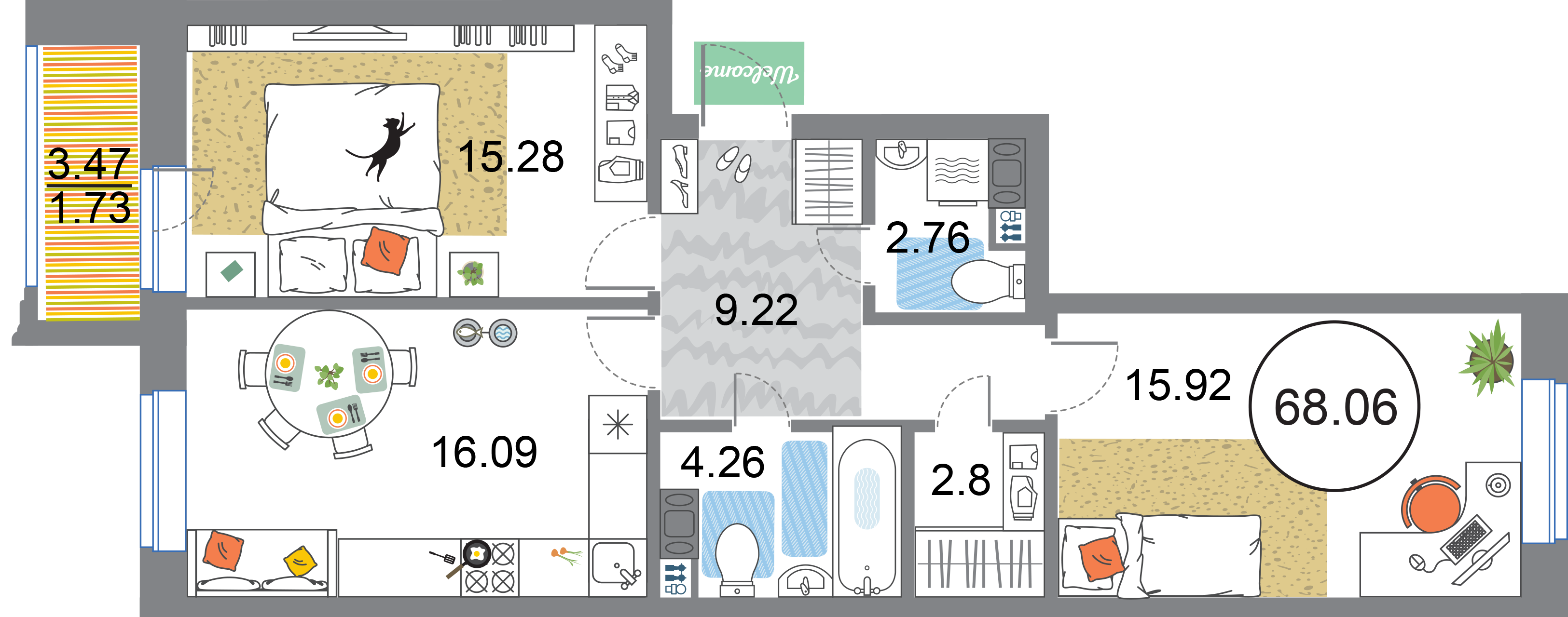 В общей сложности будет представлено 1585 квартир разной планировки. На выбор квартиры студии, а также одно-двух и трехкомнатные квартиры. Некоторые из них имеют приватные террасы и ванные комнаты с окнами, другие же укомплектованы кухнями-гостиными, мастер-спальнями и гардеробными. Высота потолков – 3,3 метра. Окна в квартирах деревянные, из трехслойного бруса. Будет установлена трехслойная очистка воды.