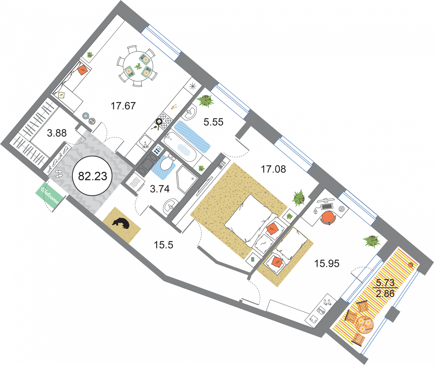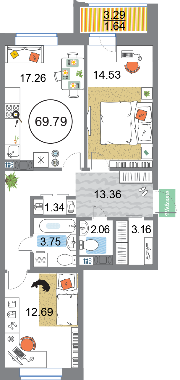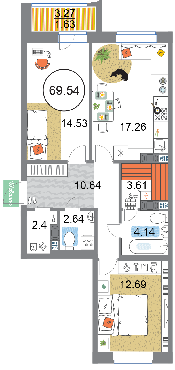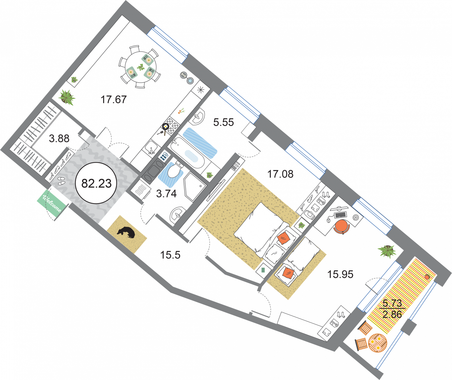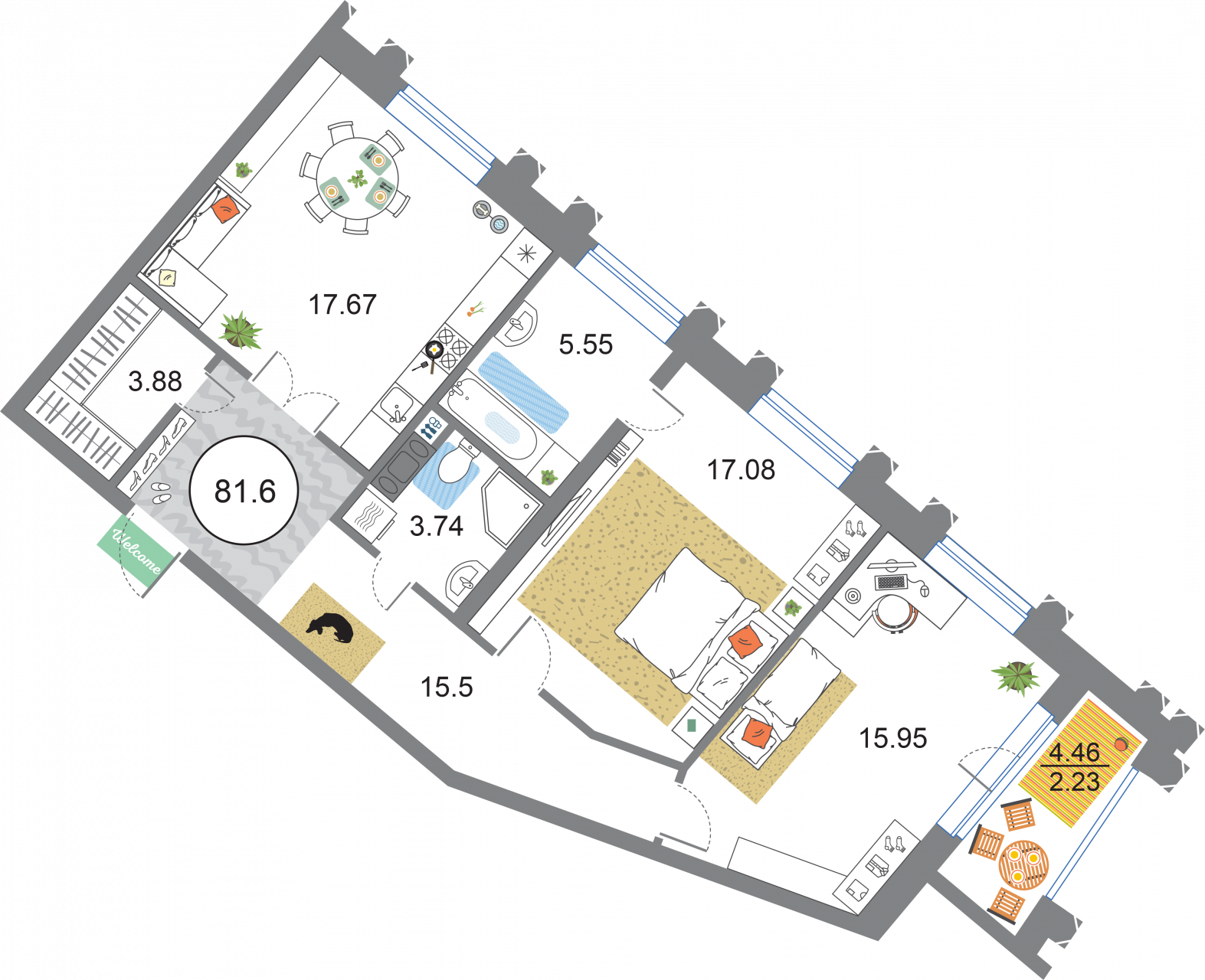 В общей сложности будет представлено 1585 квартир разной планировки. На выбор квартиры студии, а также одно-двух и трехкомнатные квартиры. Некоторые из них имеют приватные террасы и ванные комнаты с окнами, другие же укомплектованы кухнями-гостиными, мастер-спальнями и гардеробными. Высота потолков – 3,3 метра. Окна в квартирах деревянные, из трехслойного бруса. Будет установлена трехслойная очистка воды.
