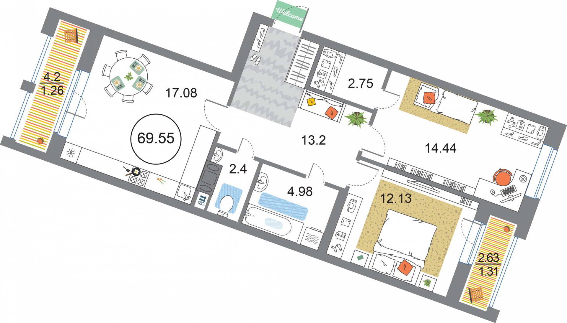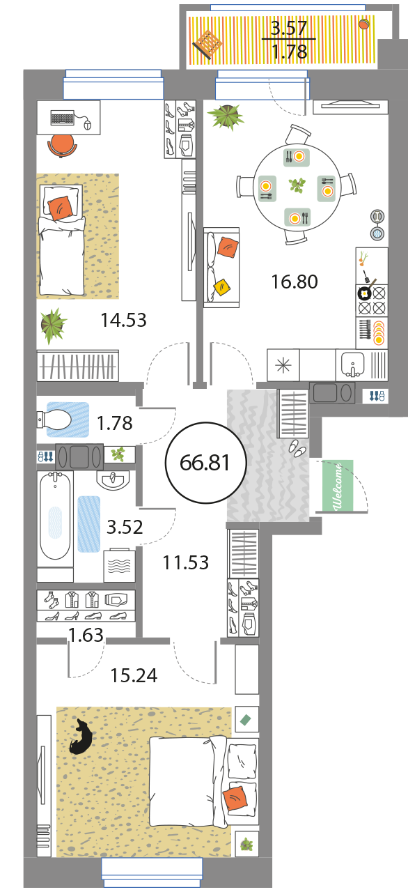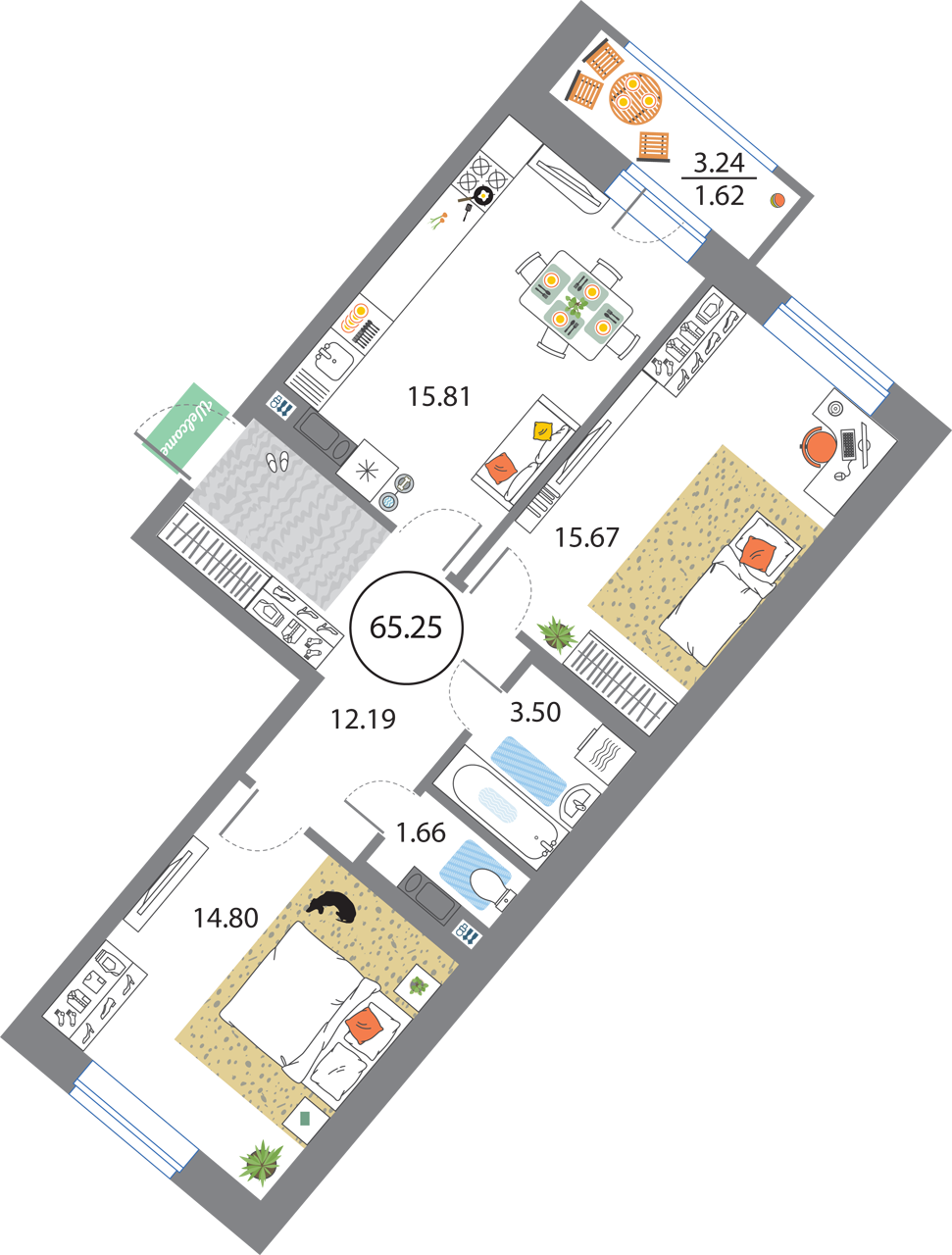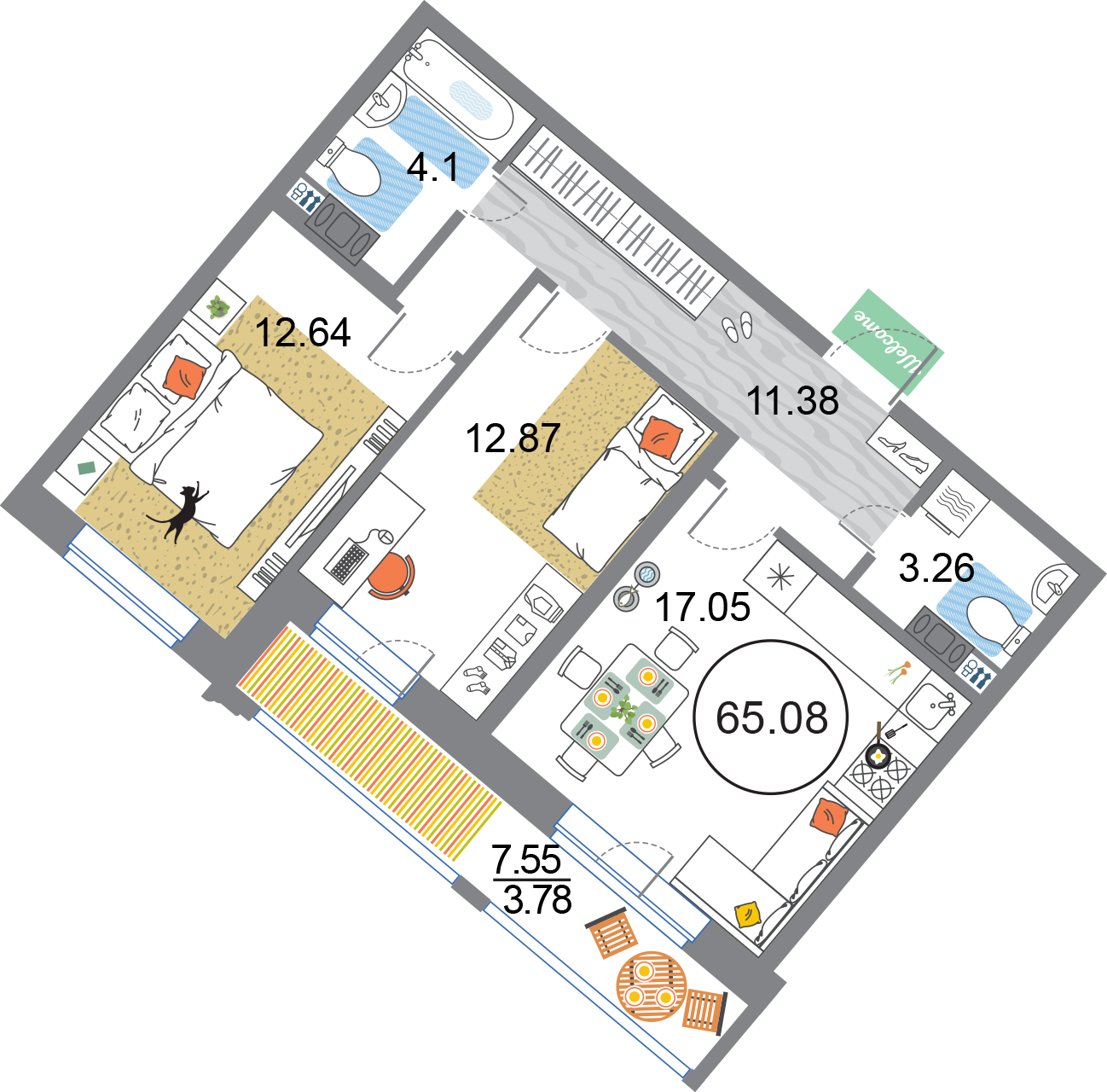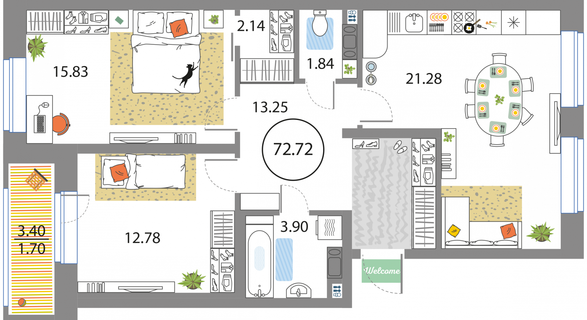 В общей сложности будет представлено 1585 квартир разной планировки. На выбор квартиры студии, а также одно-двух и трехкомнатные квартиры. Некоторые из них имеют приватные террасы и ванные комнаты с окнами, другие же укомплектованы кухнями-гостиными, мастер-спальнями и гардеробными. Высота потолков – 3,3 метра. Окна в квартирах деревянные, из трехслойного бруса. Будет установлена трехслойная очистка воды.