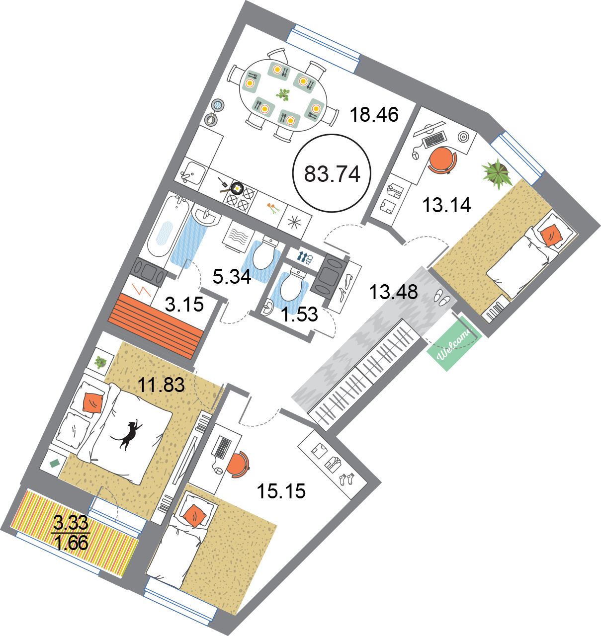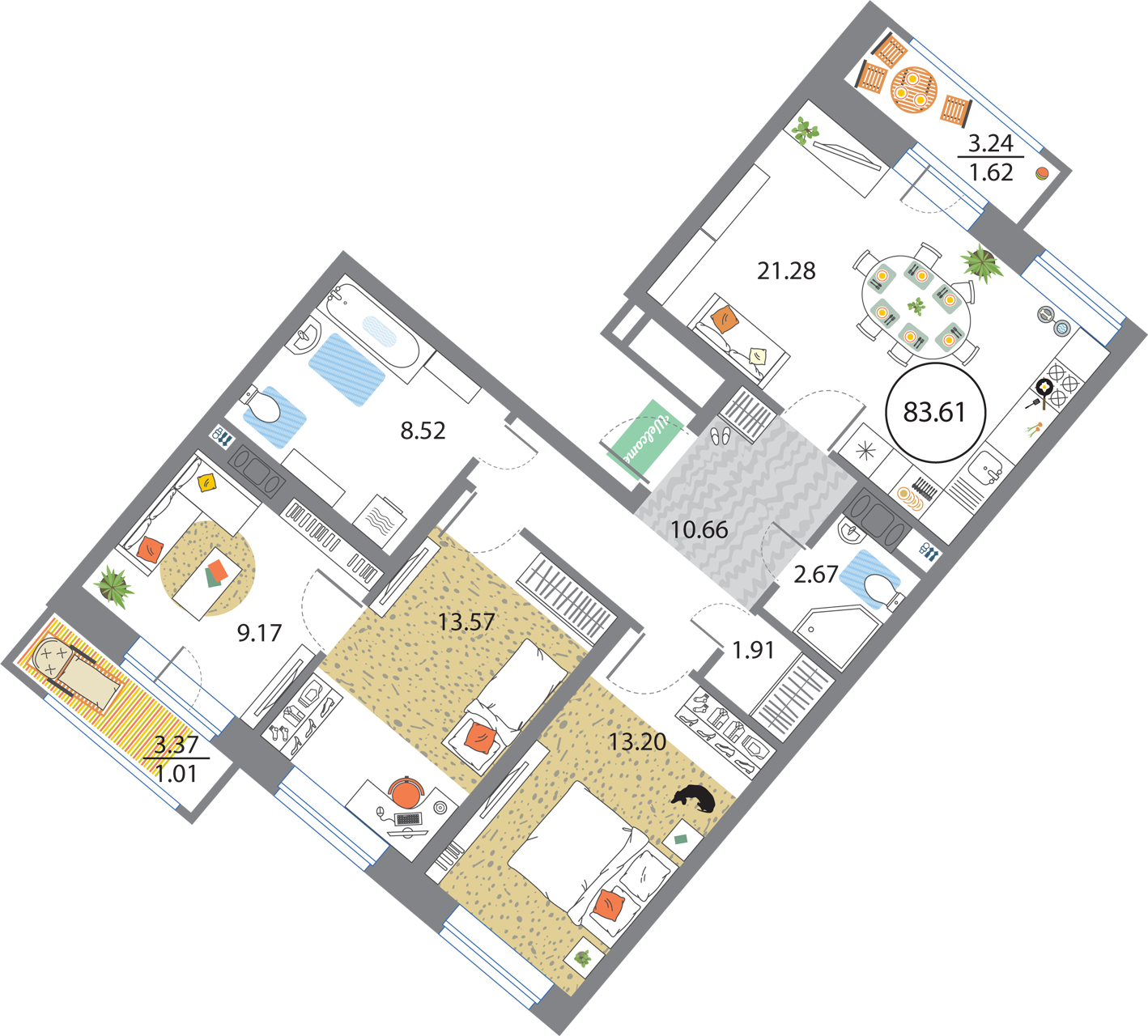 В общей сложности будет представлено 1585 квартир разной планировки. На выбор квартиры студии, а также одно-двух и трехкомнатные квартиры. Некоторые из них имеют приватные террасы и ванные комнаты с окнами, другие же укомплектованы кухнями-гостиными, мастер-спальнями и гардеробными. Высота потолков – 3,3 метра. Окна в квартирах деревянные, из трехслойного бруса. Будет установлена трехслойная очистка воды.