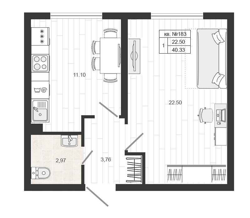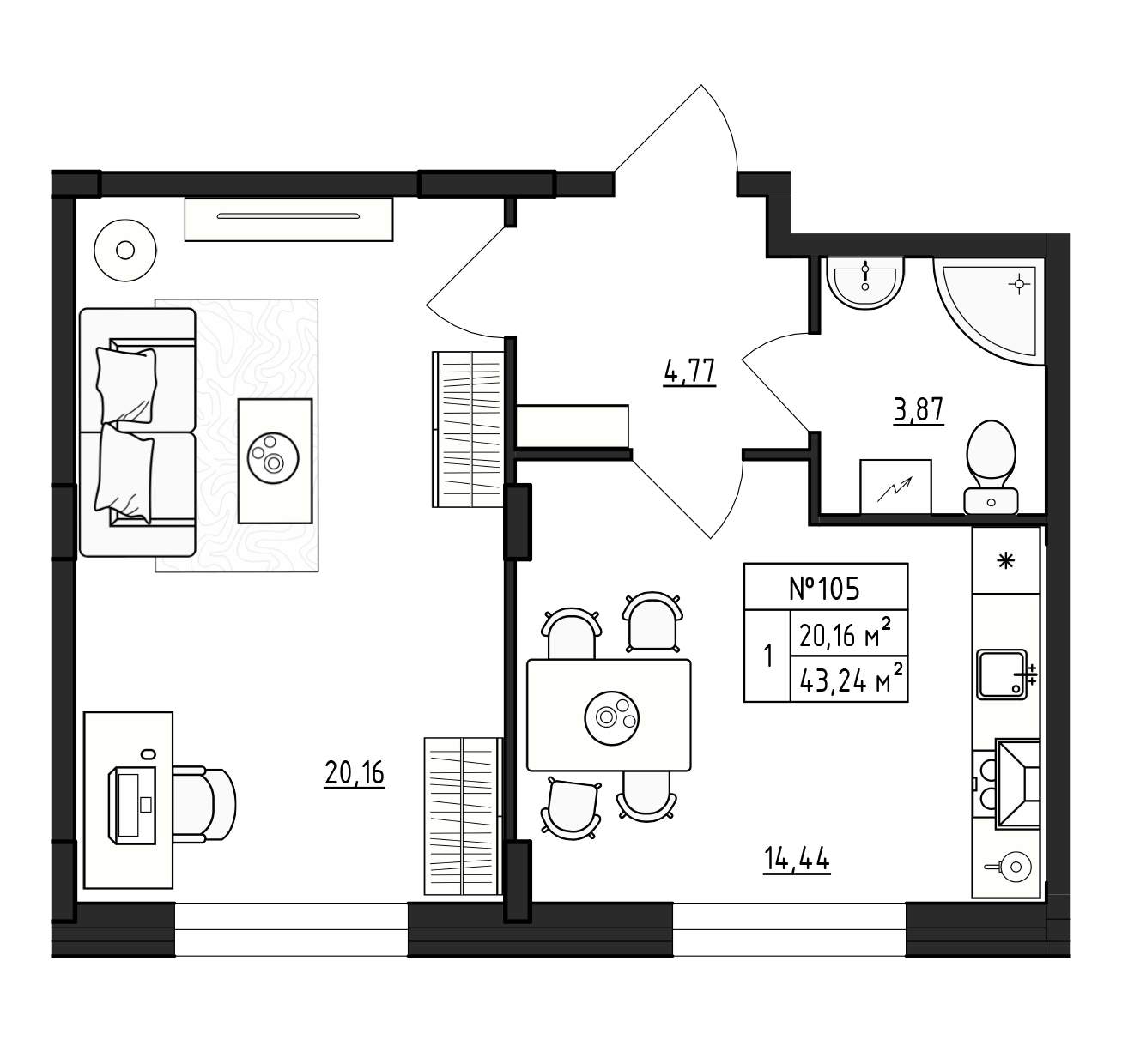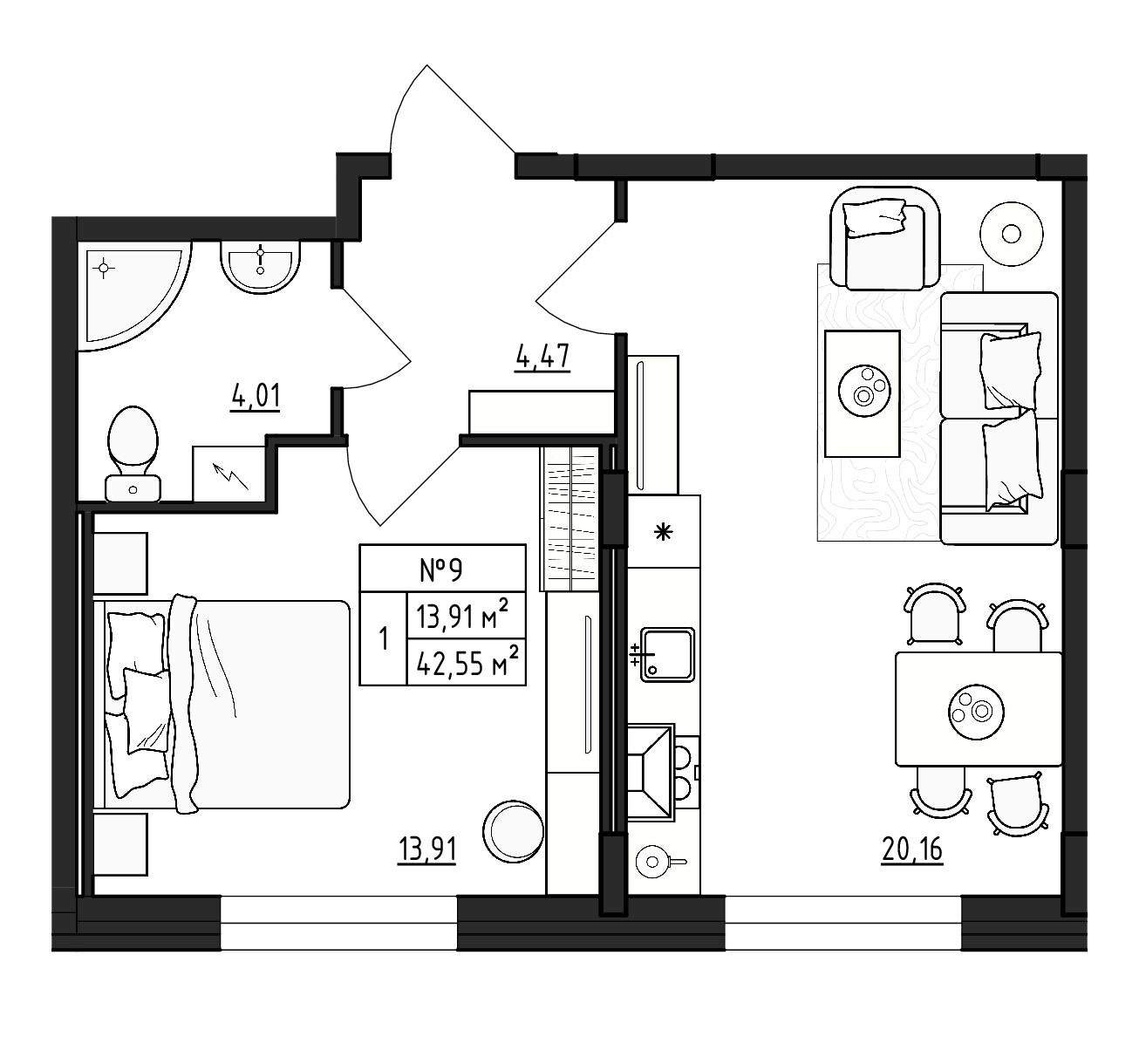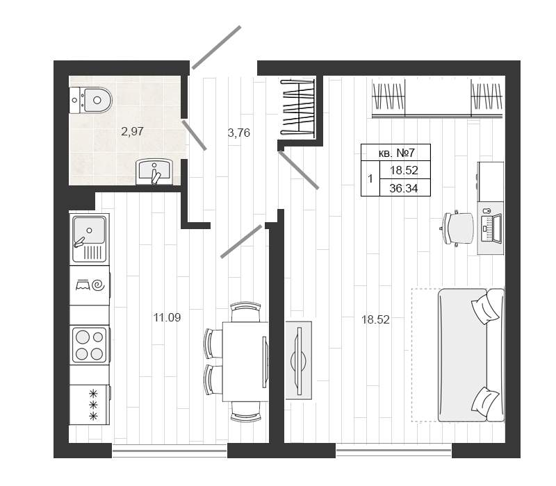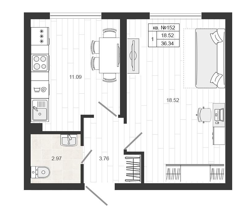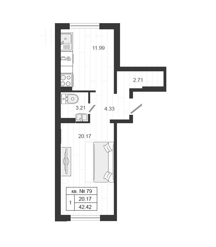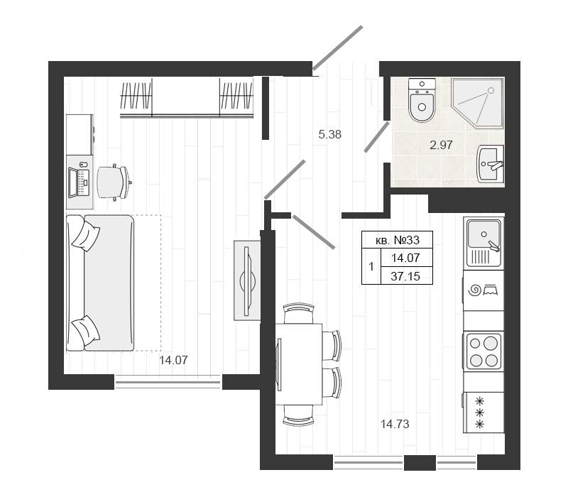 Квартирография – одно – двухкомнатные квартиры, квартиры со свободной планировкой. Площадь жилья варьируется от 17 до 59 кв.м. В двухкомнатных квартирах санузел раздельный, есть варианты с балконом. Застройщик сдает жилье без отделки. Будут подведены коммуникации, установлены окна, входные двери, счетчики.