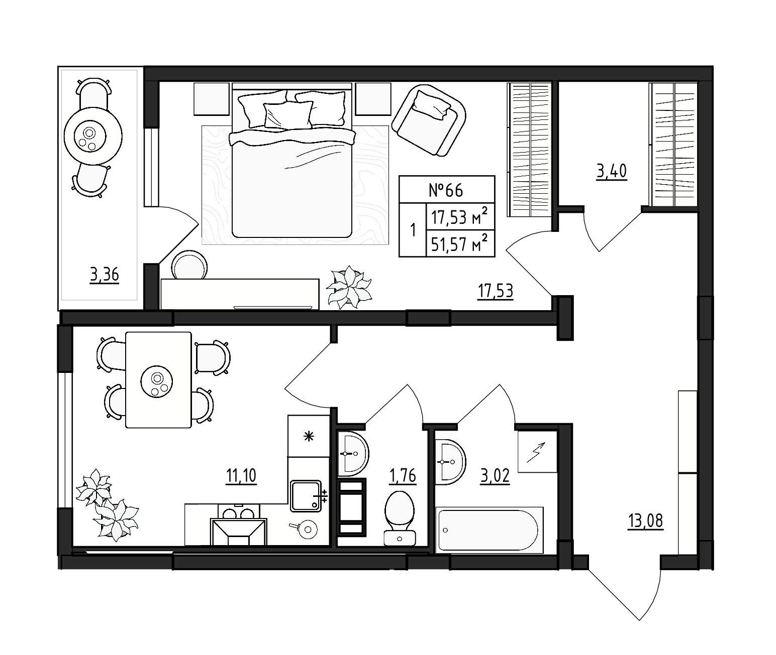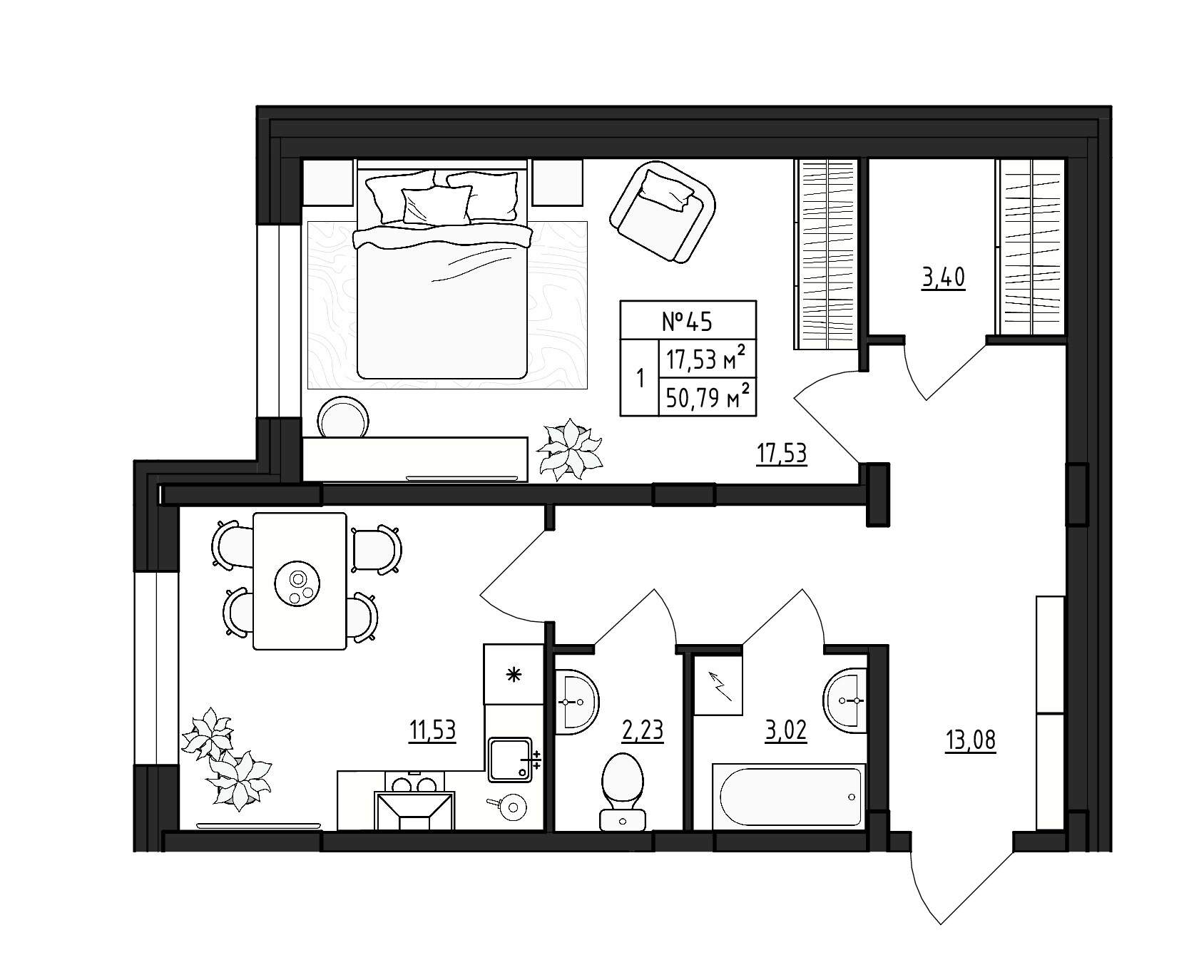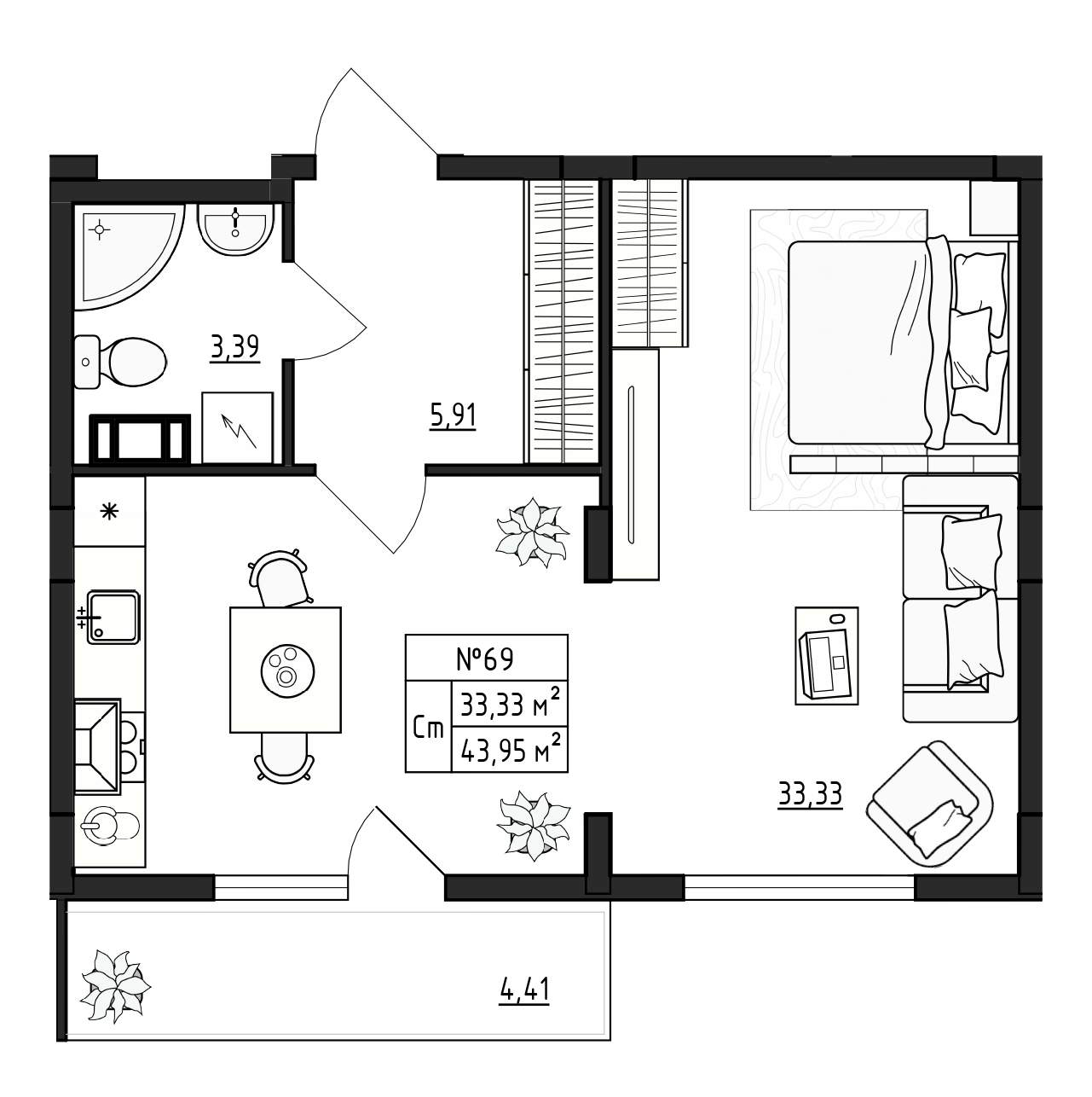 Квартирография – одно – двухкомнатные квартиры, квартиры со свободной планировкой. Площадь жилья варьируется от 17 до 59 кв.м. В двухкомнатных квартирах санузел раздельный, есть варианты с балконом. Застройщик сдает жилье без отделки. Будут подведены коммуникации, установлены окна, входные двери, счетчики.