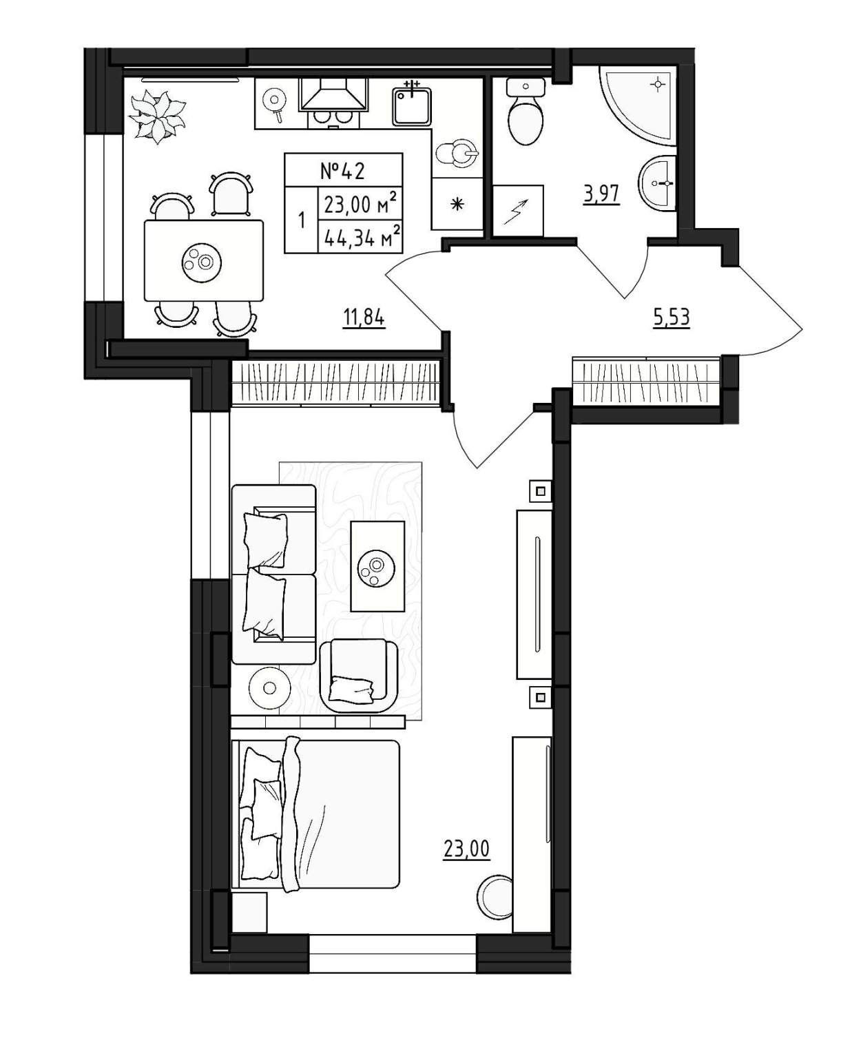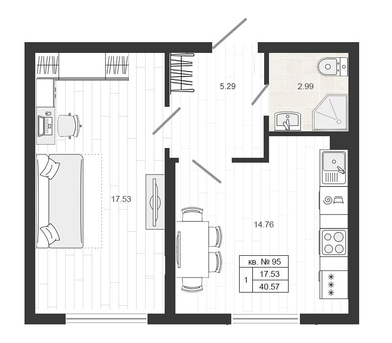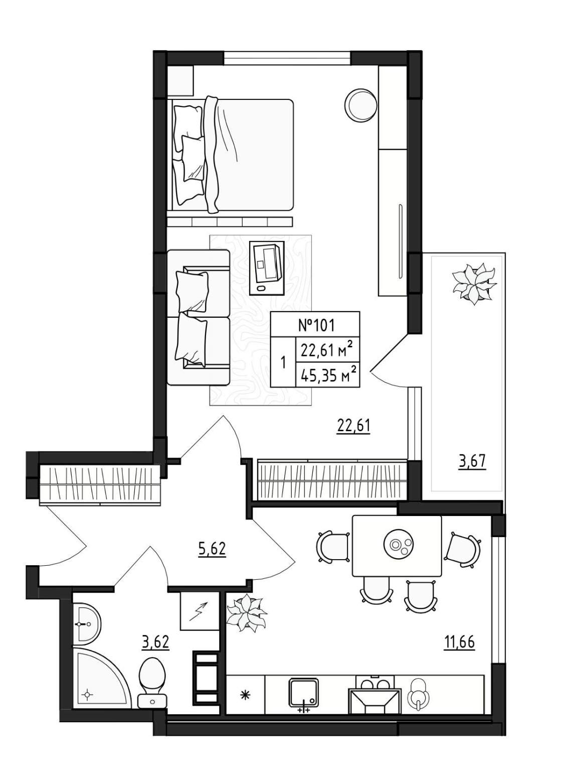 Квартирография – одно – двухкомнатные квартиры, квартиры со свободной планировкой. Площадь жилья варьируется от 17 до 59 кв.м. В двухкомнатных квартирах санузел раздельный, есть варианты с балконом. Застройщик сдает жилье без отделки. Будут подведены коммуникации, установлены окна, входные двери, счетчики.