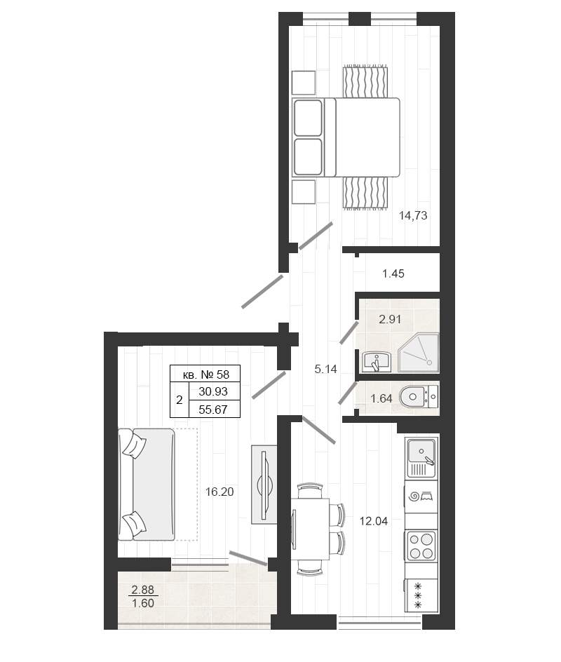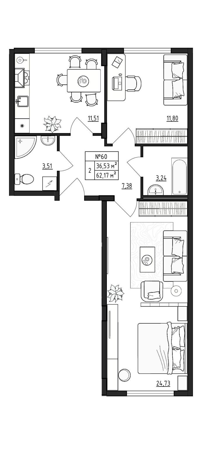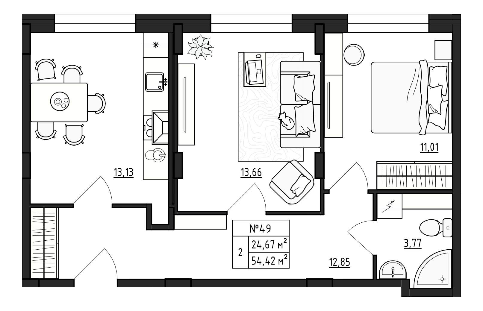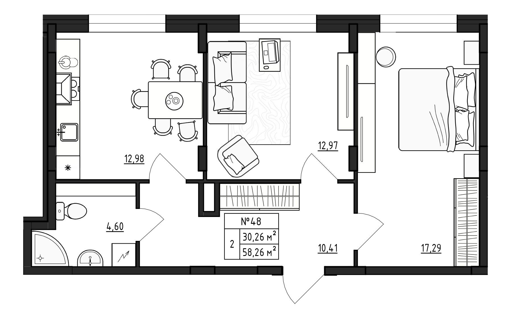 Квартирография – одно – двухкомнатные квартиры, квартиры со свободной планировкой. Площадь жилья варьируется от 17 до 59 кв.м. В двухкомнатных квартирах санузел раздельный, есть варианты с балконом. Застройщик сдает жилье без отделки. Будут подведены коммуникации, установлены окна, входные двери, счетчики.