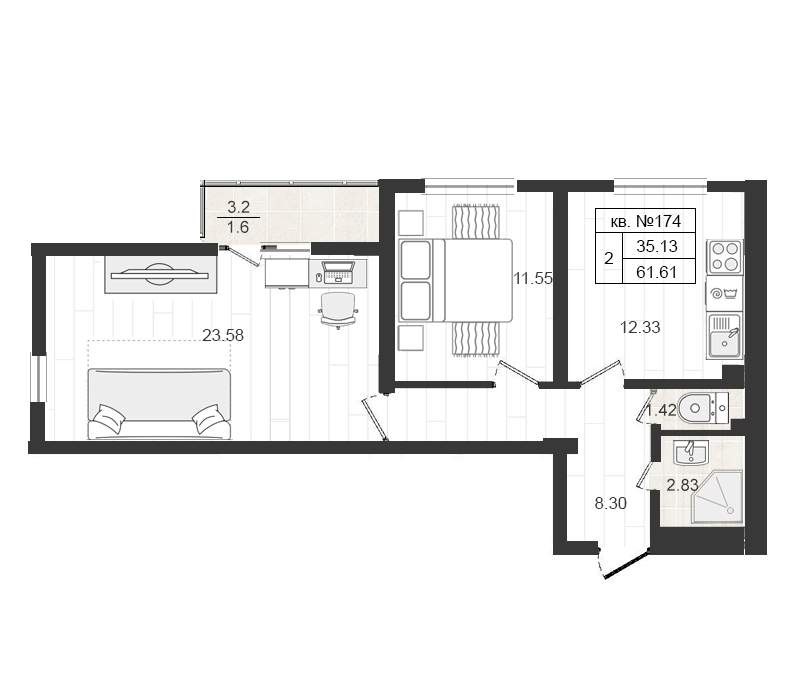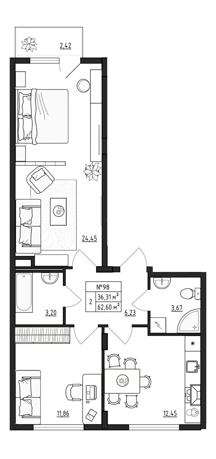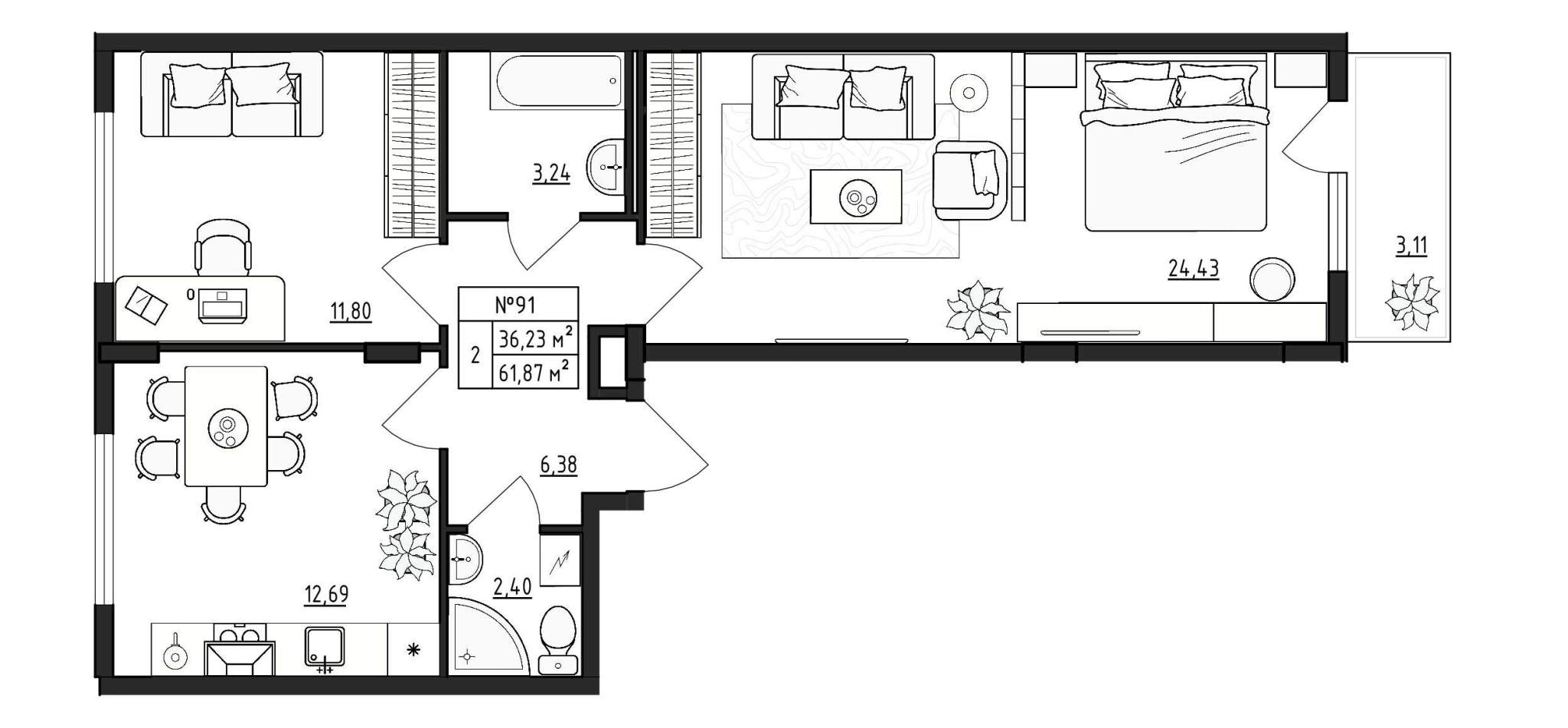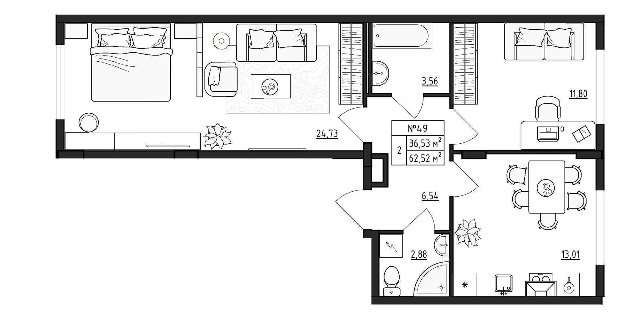 Квартирография – одно – двухкомнатные квартиры, квартиры со свободной планировкой. Площадь жилья варьируется от 17 до 59 кв.м. В двухкомнатных квартирах санузел раздельный, есть варианты с балконом. Застройщик сдает жилье без отделки. Будут подведены коммуникации, установлены окна, входные двери, счетчики.