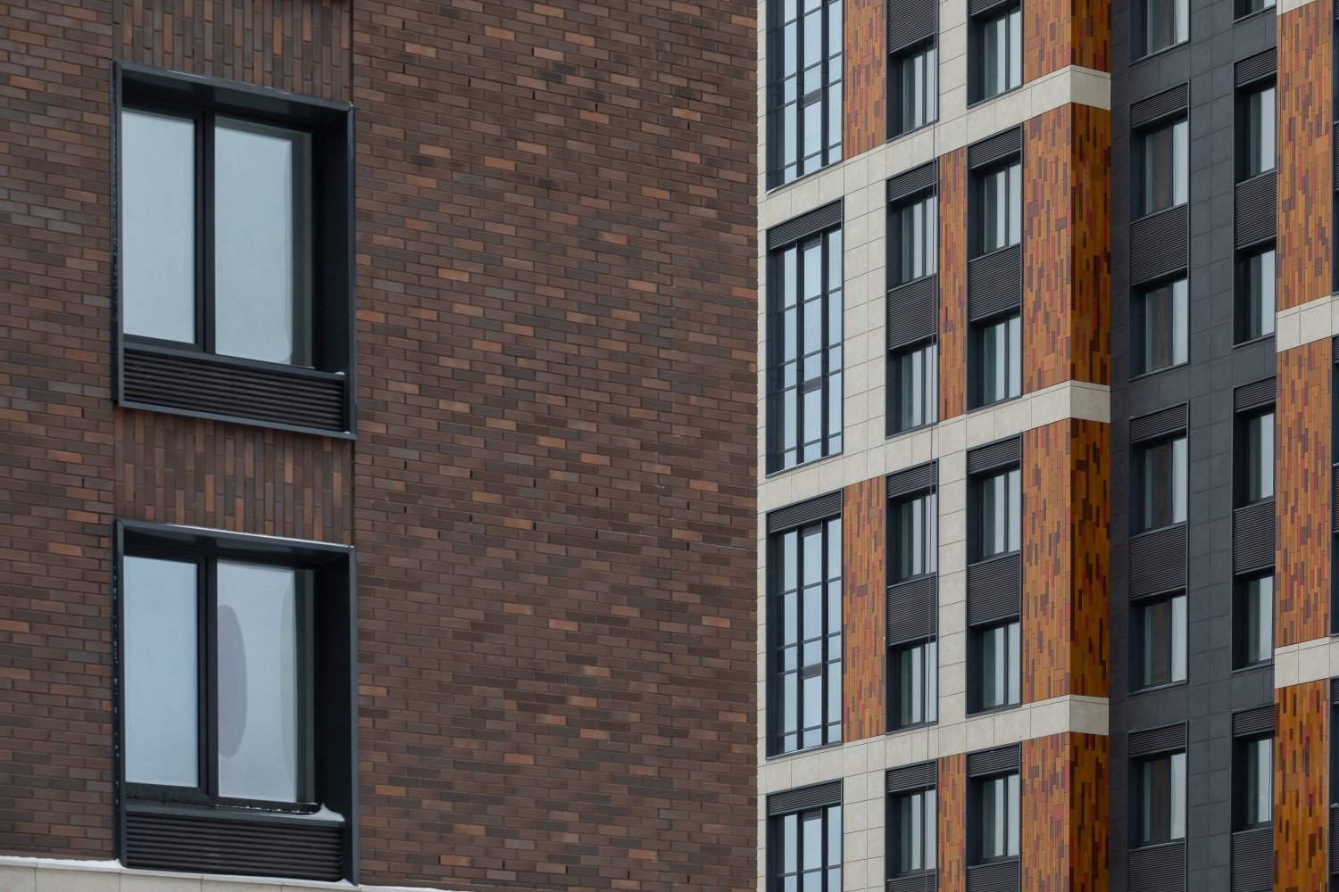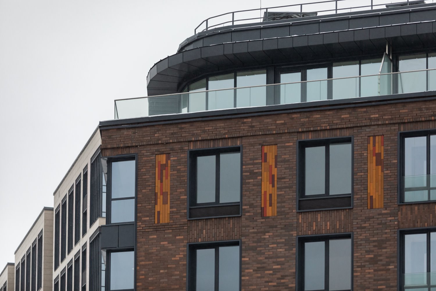 Дома ориентированы к воде, чтобы еще больше жителей могли любоваться панорамой реки. Терракотовая плитка янтарных оттенков, витражное остекление – все это привлекает внимание к Амбер Клаб. Общую эстетику зданий подчеркивает элегантная декоративная подсветка. Балконы и лоджии остеклены, а для наружных блоков кондиционеров предусмотрены специальные места – сплит лоджии, благодаря которым эстетика фасадов сохранится в первозданном виде.