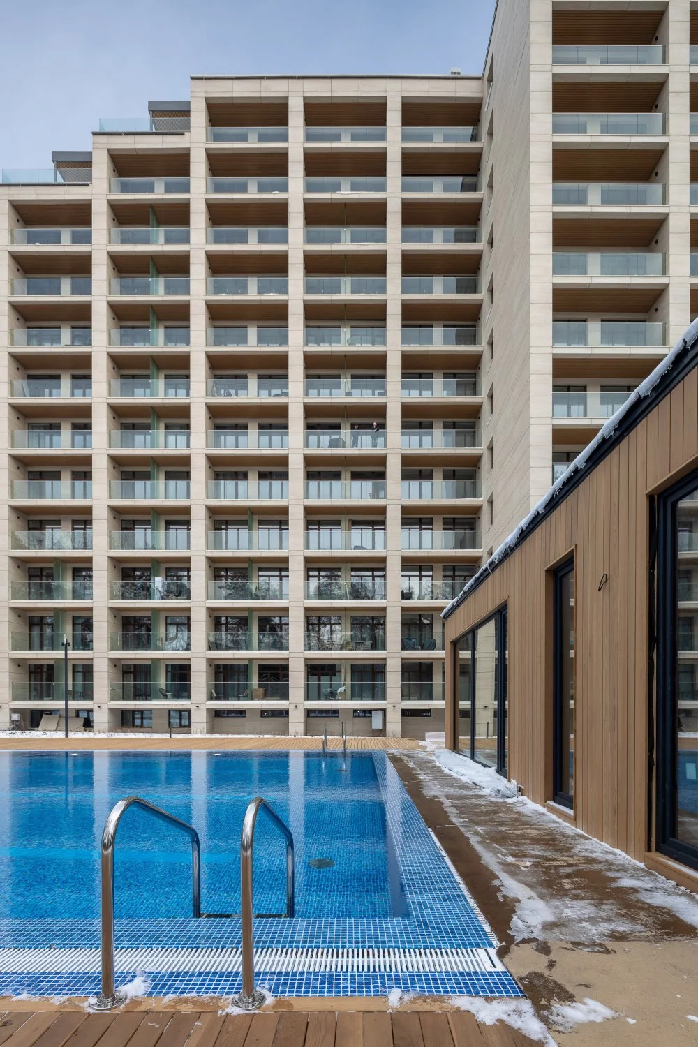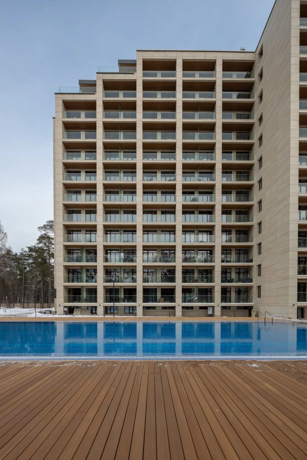 В комплексе всего 13 этажей. Из окон открывается завораживающий вид на Финский залив и многовековой лесной массив.