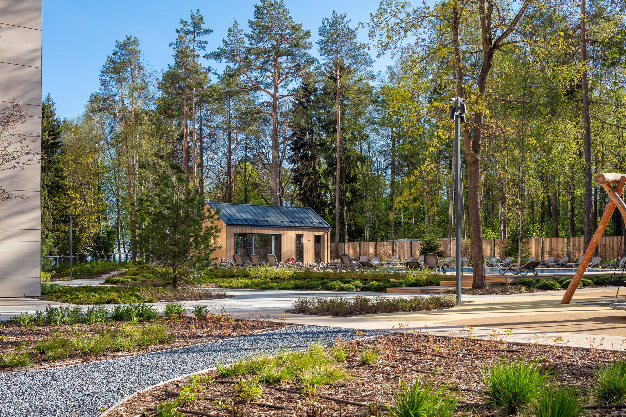 На территории комплекса предусмотрены: зона для занятий йогой, work-out с тренажёрами, детская площадка. Вымощенная плиткой дорожка до Финского залива, украшенная малыми архитектурными формами. В центре двора запроектирован арт-объект.