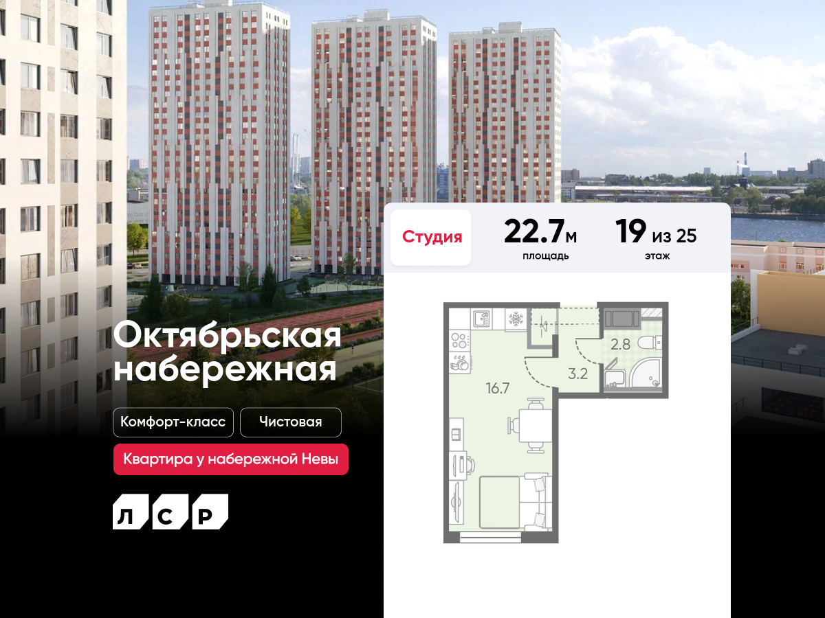 «Октябрьская набережная» – это жилой комплекс комфорт-класса на первой береговой линии Невы, в перспективной локации рядом с Большим Обуховским мостом. Представляет собой проект на 11 домов, которые будут строиться в три очереди. Жилой комплекс предполагает создание благоустроенной среды: зеленые дворы с площадками для спорта и игр, коммерческая инфраструктура на первых этажах, паркинги, площадка для выгула собак и станции зарядки электромобилей. Также в рамках проекта мы возводим детский сад и школу.