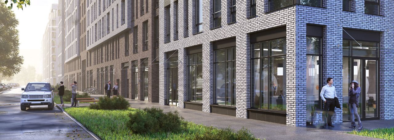 Архитектурный облик проекта – это сочетание классики и современности. Дома выполнены в форме прямоугольного каре, а в центре каждого находится просторный внутренний двор. Кирпич контрастных оттенков создает увлекательные графичные узоры на фасадах.