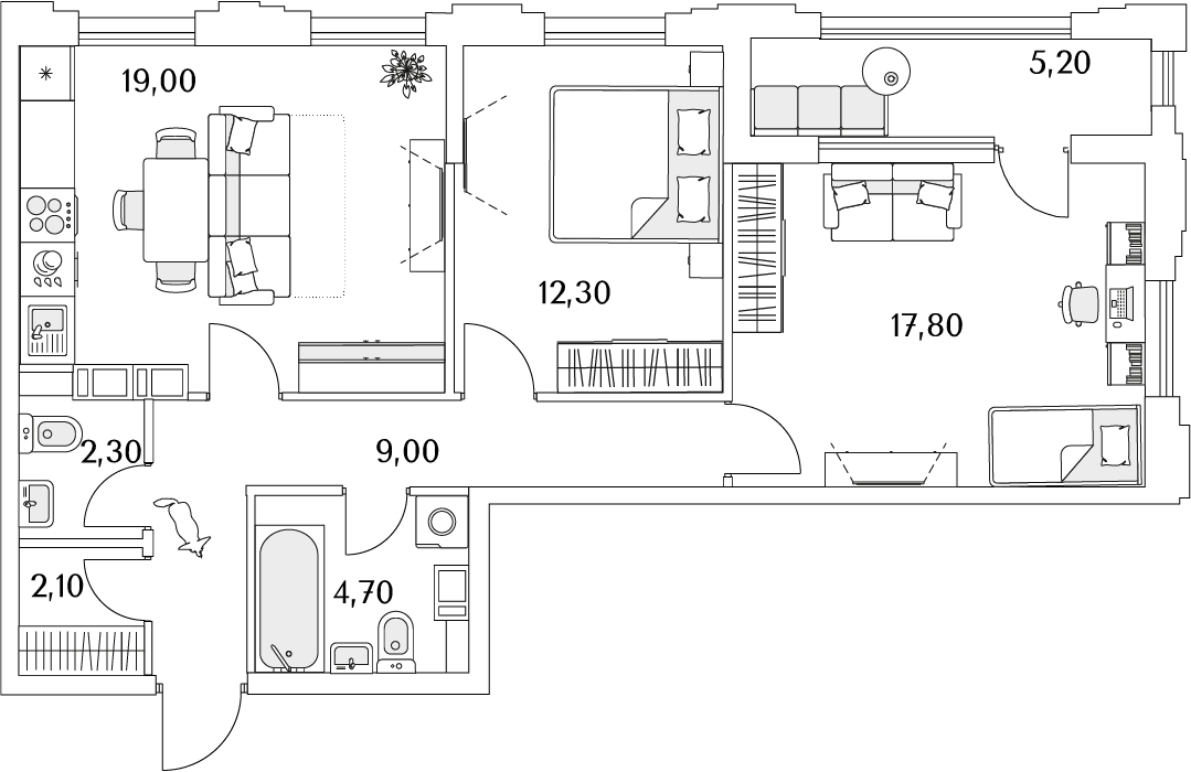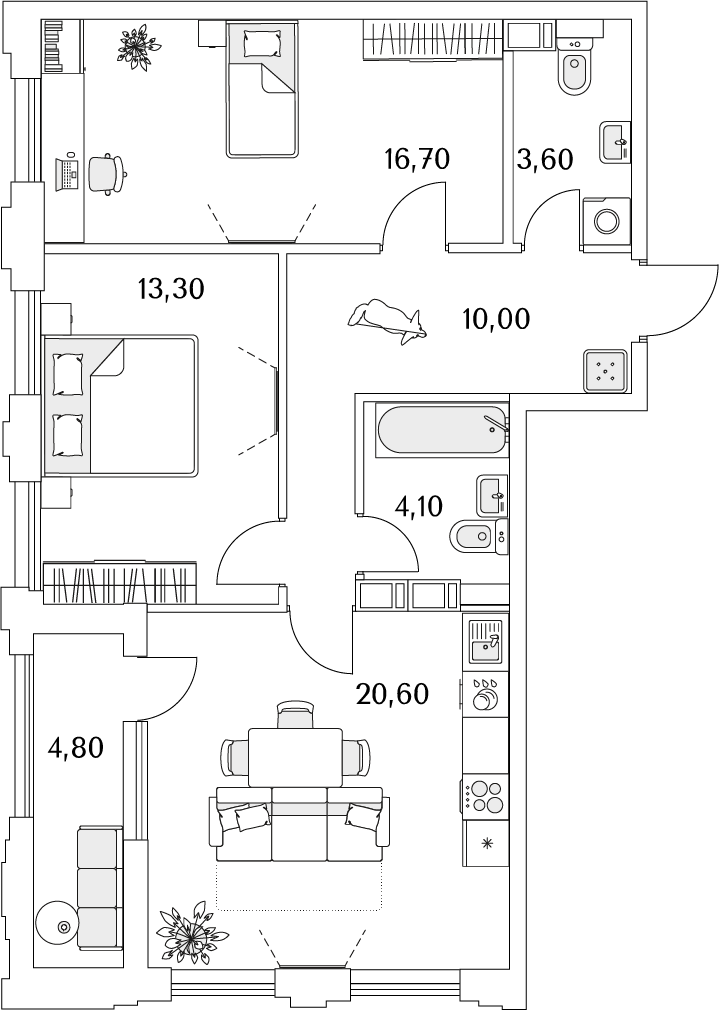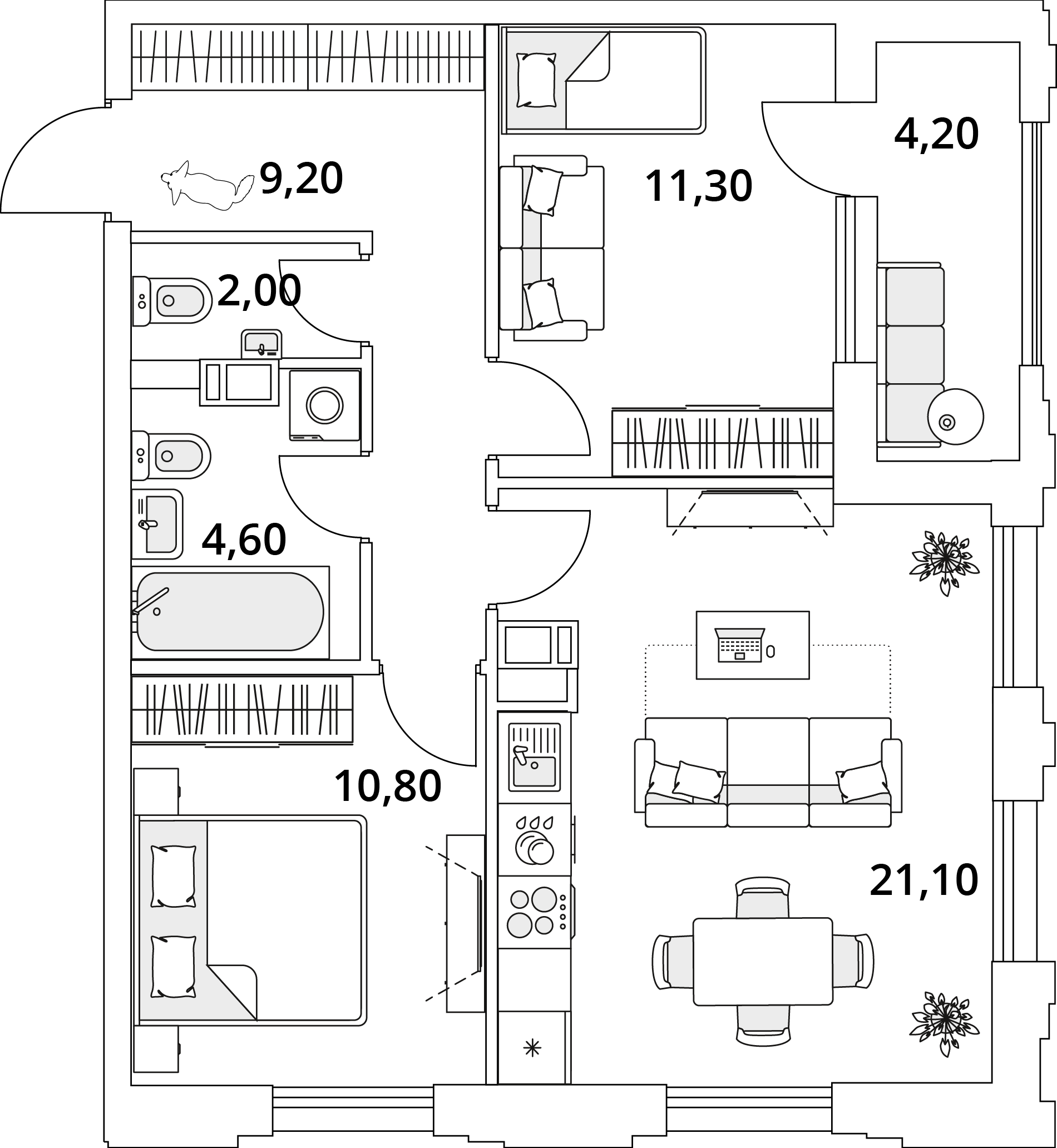 Доступны квартиры разной планировки и площади. Жильцы смогут выбрать из трех вариантов отделки. Чистовую дизайнерскую стоит взять тем, кто хочет поскорее заселиться. Предчистовая (white box) подойдет желающим выбрать цвет стен и плитки — самые грязные и шумные работы выполнит застройщик. А квартира без отделки — хороший вариант для тех, кто хочет сделать масштабный ремонт самостоятельно.