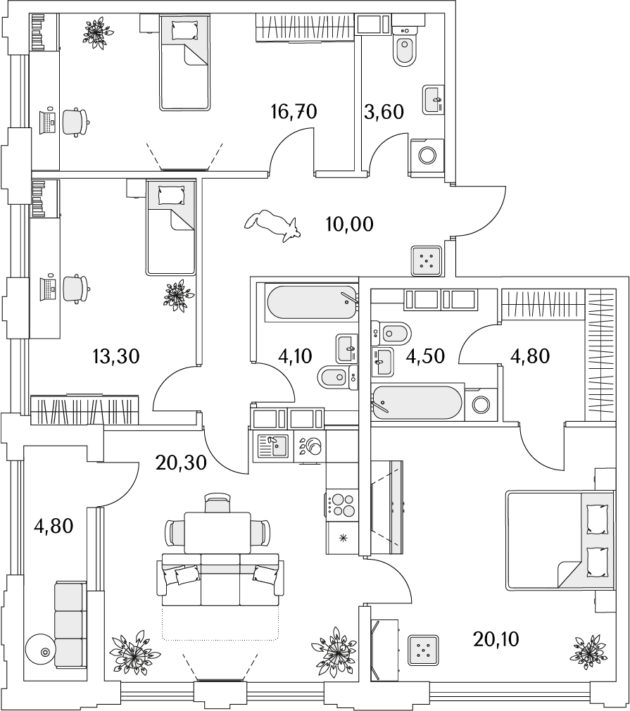 Доступны квартиры разной планировки и площади. Жильцы смогут выбрать из трех вариантов отделки. Чистовую дизайнерскую стоит взять тем, кто хочет поскорее заселиться. Предчистовая (white box) подойдет желающим выбрать цвет стен и плитки — самые грязные и шумные работы выполнит застройщик. А квартира без отделки — хороший вариант для тех, кто хочет сделать масштабный ремонт самостоятельно.