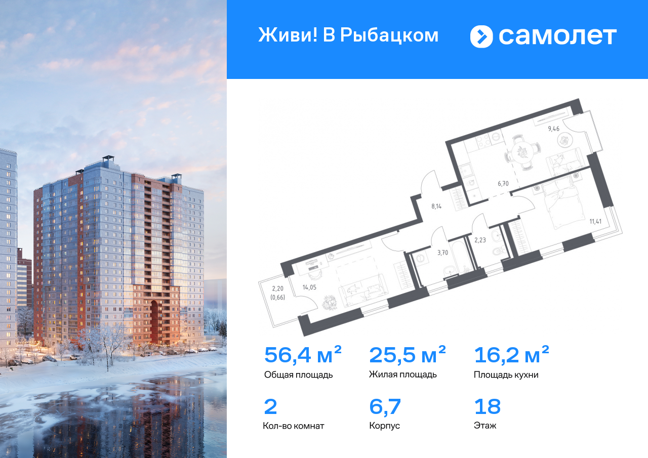 В ванной комнате на стенах и полу ляжет кафельная плитка, а входная дверь будет железной. Лоджии и балконы новостройки будут остеклёнными.На выбор предоставлены квартиры различной планировки и метража:• студии: 23.94 от 39.11 до м2 • 1 комнатные: от 32.76 до 43.05 м2 • 2-х комнатные: от 52.56 до 63.54 м2 • 3-х комнатные: от 69.83 до 83.14 м2 Инфраструктура В ЖК “Живи! В Рыбацком” будет осуществлён проект по возведению:• 4-х детских садиков;• общеобразовательной школы.В ЖК благоустроят пешеходные зоны, которые предоставят удобную прогулку вдоль берегов Невы. В проект жилого комплекса войдут скамейки для отдыха, скверы, уютные сады, а также оборудованные спортивные площадки для взрослых и детей.
